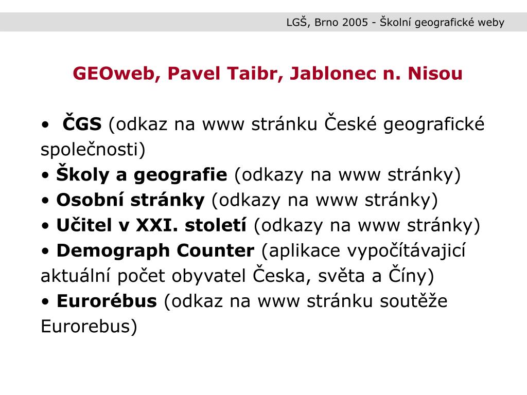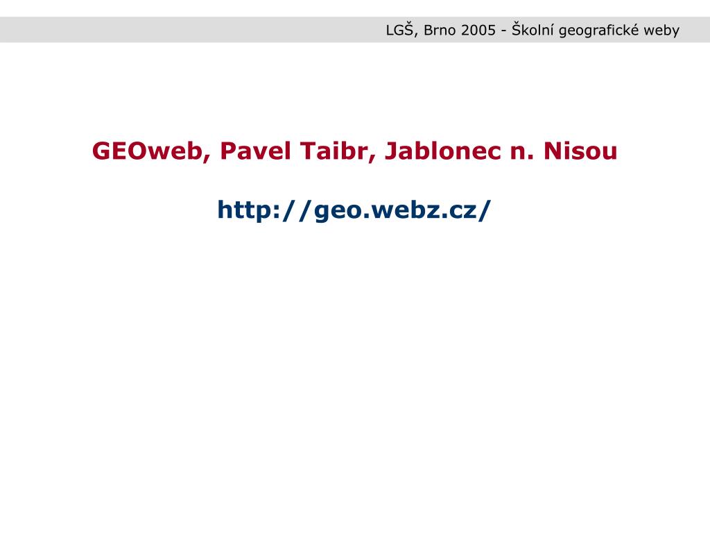 LGŠ, Brno 2005 - Školní geografické weby GEOweb, Pavel Taibr, Jablonec n. Nisou http://geo.webz.cz/