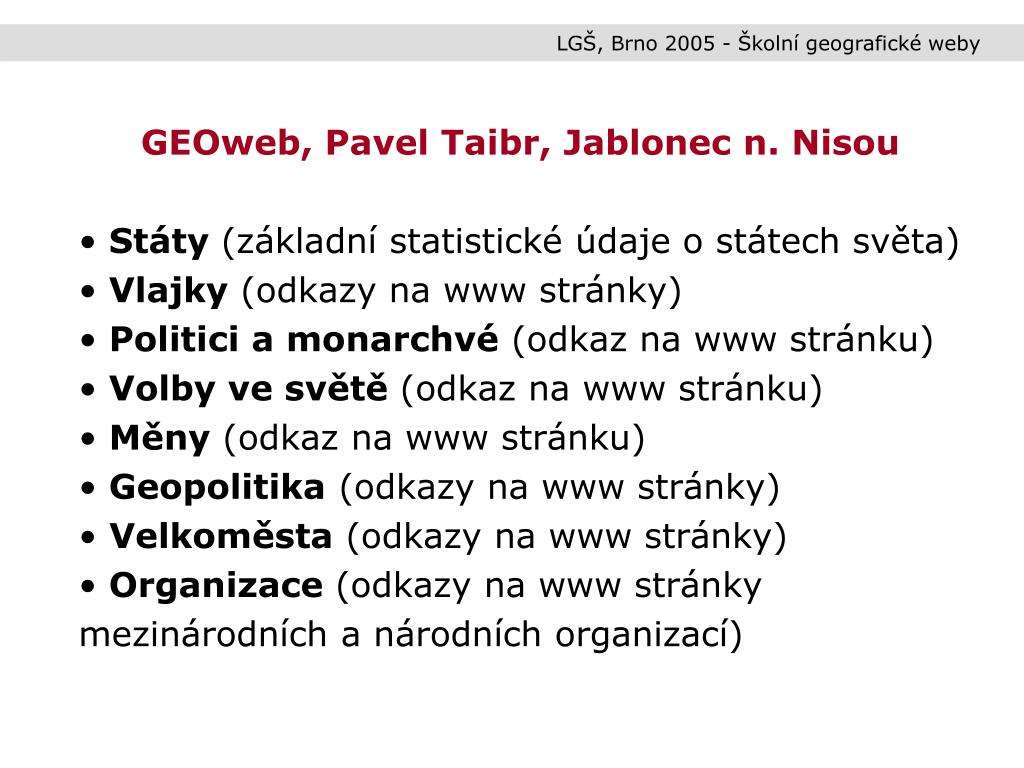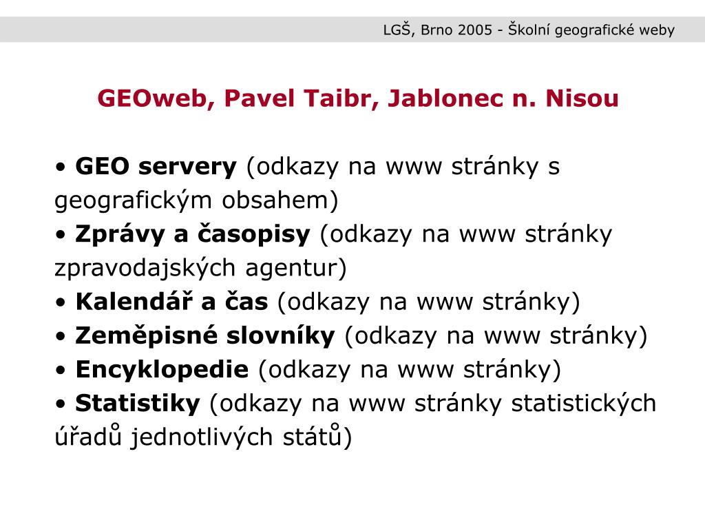 LGŠ, Brno 2005 - Školní geografické weby • GEOweb, Pavel Taibr, Jablonec n. Nisou • GEO servery (odkazy na www stránky s geografickým obsahem) • Zprávy a časopisy (odkazy na www stránky zpravodajských agentur) • Kalendář a čas (odkazy na www stránky) • Zeměpisné slovníky (odkazy na www stránky) • Encyklopedie (odkazy na www stránky) • Statistiky (odkazy na www stránky statistických úřadů jednotlivých států)