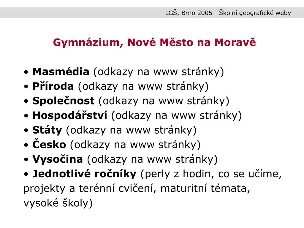 LGŠ, Brno 2005 - Školní geografické weby • Gymnázium, Nové Město na Moravě • Masmédia (odkazy na www stránky) • Příroda (odkazy na www stránky) • Společnost (odkazy na www stránky) • Hospodářství (odkazy na www stránky) • Státy (odkazy na www stránky) • Česko (odkazy na www stránky) • Vysočina (odkazy na www stránky) • Jednotlivé ročníky (perly z hodin, co se učíme, projekty a terénní cvičení, maturitní témata, vysoké školy)