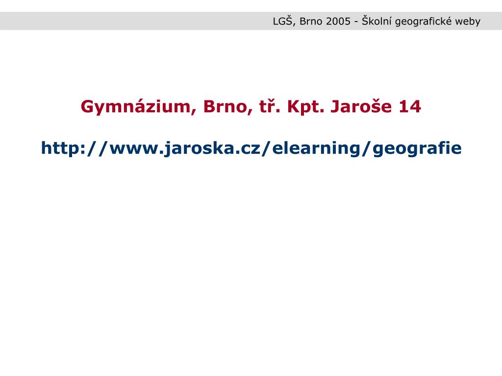 LGŠ, Brno 2005 - Školní geografické weby Gymnázium, Brno, tř. Kpt. Jaroše 14 http://www.jaroska.cz/elearning/geografie
