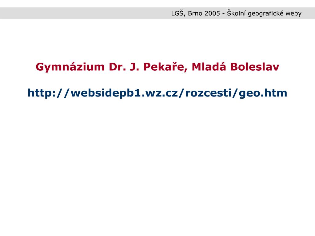 LGŠ, Brno 2005 - Školní geografické weby Gymnázium Dr. J. Pekaře, Mladá Boleslav http://websidepb1.wz.cz/rozcesti/geo.htm