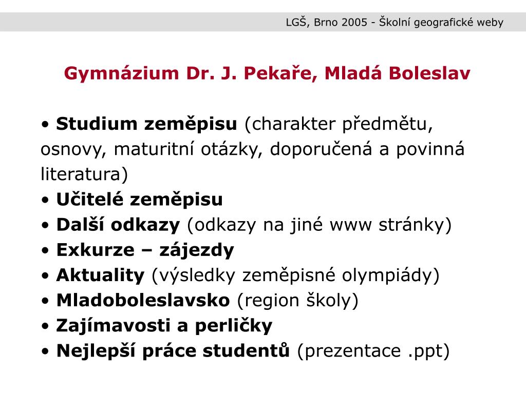 LGŠ, Brno 2005 - Školní geografické weby • Gymnázium Dr. J. Pekaře, Mladá Boleslav • Studium zeměpisu (charakter předmětu, osnovy, maturitní otázky, doporučená a povinná literatura) • Učitelé zeměpisu • Další odkazy (odkazy na jiné www stránky) • Exkurze – zájezdy • Aktuality (výsledky zeměpisné olympiády) • Mladoboleslavsko (region školy) • Zajímavosti a perličky • Nejlepší práce studentů (prezentace .ppt)