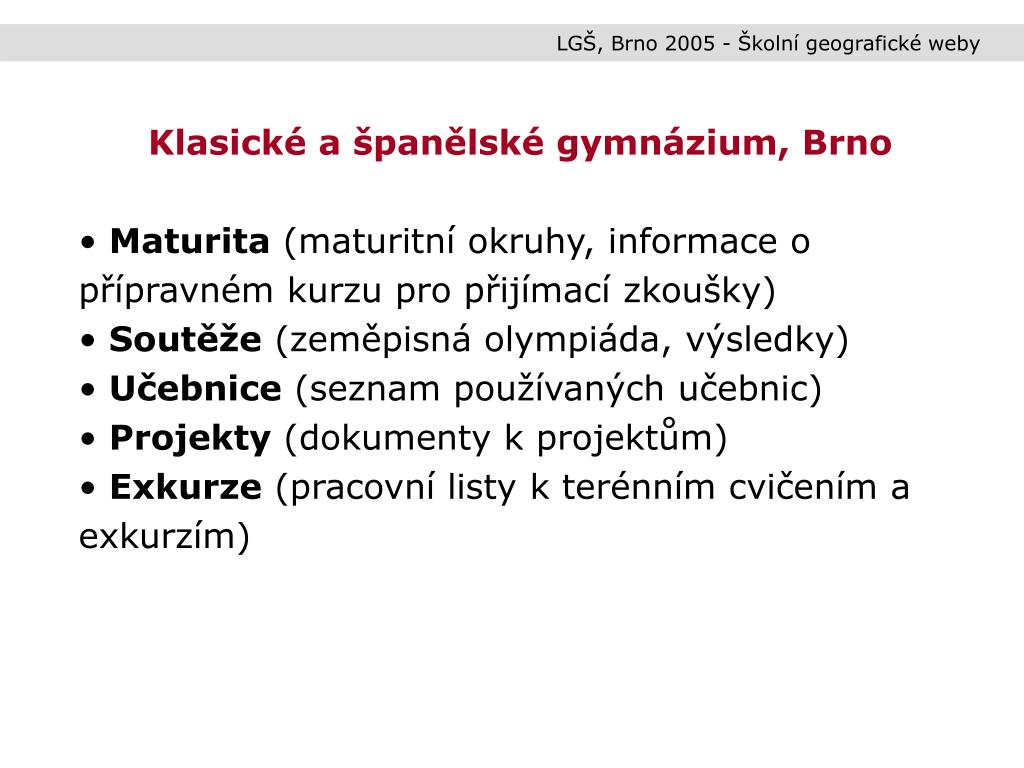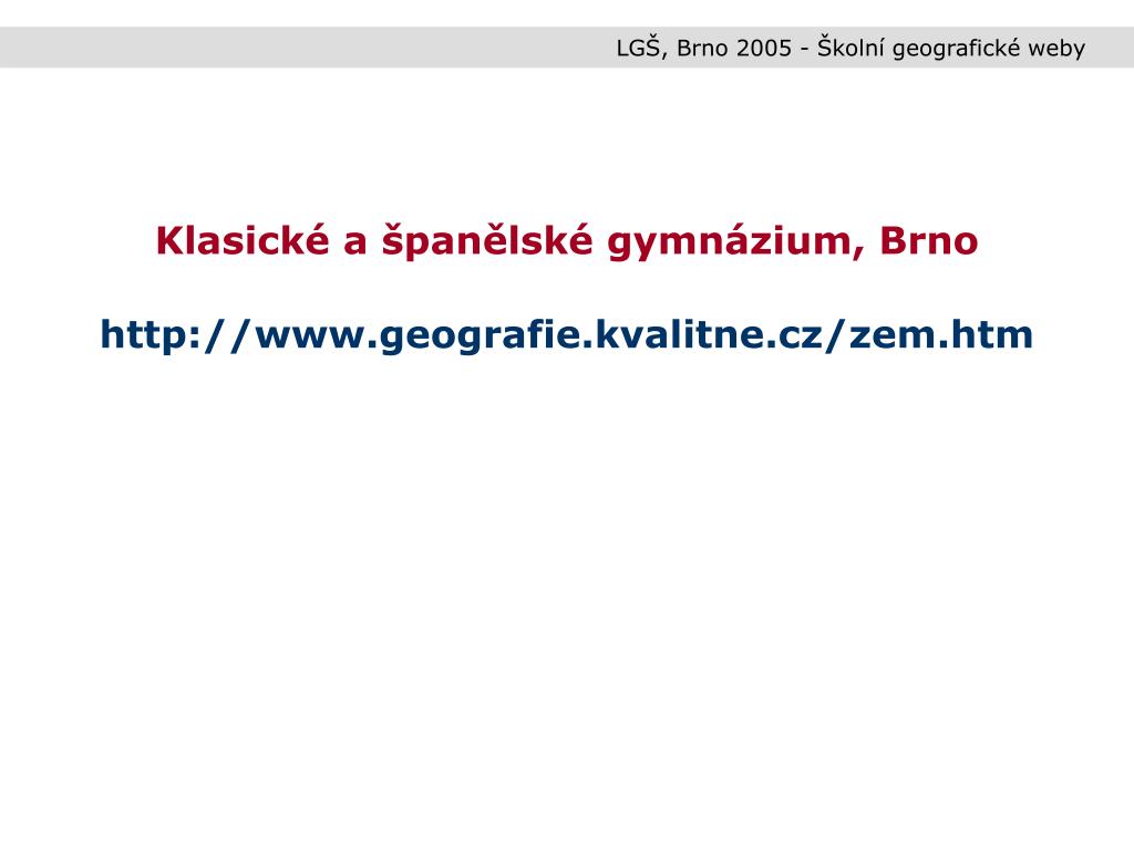 LGŠ, Brno 2005 - Školní geografické weby • Klasické a španělské gymnázium, Brno • Tématické okruhy (fyzická geografie, humánní geografie, planeta Země, kartografie, regiony, oceány, ochrana přírody – obrázky, texty, dokumenty) • Odkazy (odkazy na www stránky s geografickým obsahem) • Učebnice (seznam používaných učebnic) • Projekty (dokumenty k projektům) • Exkurze (pracovní listy k terénním cvičením a exkurzím)