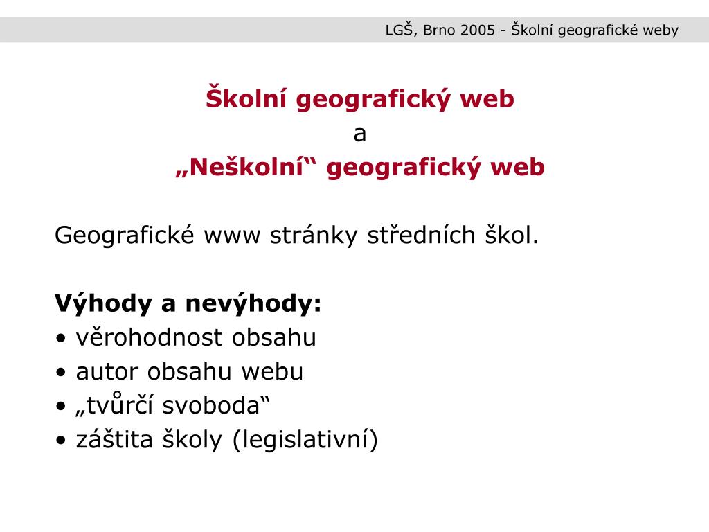 LGŠ, Brno 2005 - Školní geografické weby • Školní geografický web • a • „Neškolní“ geografický web • Geografické www stránky středních škol. • Výhody a nevýhody: • věrohodnost obsahu • autor obsahu webu • „tvůrčí svoboda“ • záštita školy (legislativní)