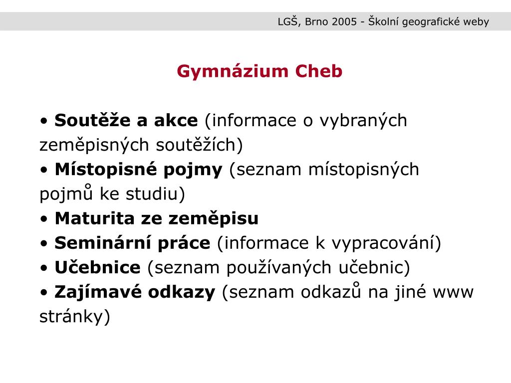 LGŠ, Brno 2005 - Školní geografické weby • Gymnázium Cheb • Soutěže a akce (informace o vybraných zeměpisných soutěžích) • Místopisné pojmy (seznam místopisných pojmů ke studiu) • Maturita ze zeměpisu • Seminární práce (informace k vypracování) • Učebnice (seznam používaných učebnic) • Zajímavé odkazy (seznam odkazů na jiné www stránky)