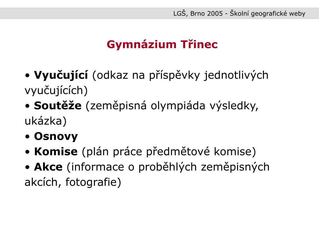 LGŠ, Brno 2005 - Školní geografické weby • Gymnázium Třinec • Vyučující (odkaz na příspěvky jednotlivých vyučujících) • Soutěže (zeměpisná olympiáda výsledky, ukázka) • Osnovy • Komise (plán práce předmětové komise) • Akce (informace o proběhlých zeměpisných akcích, fotografie)