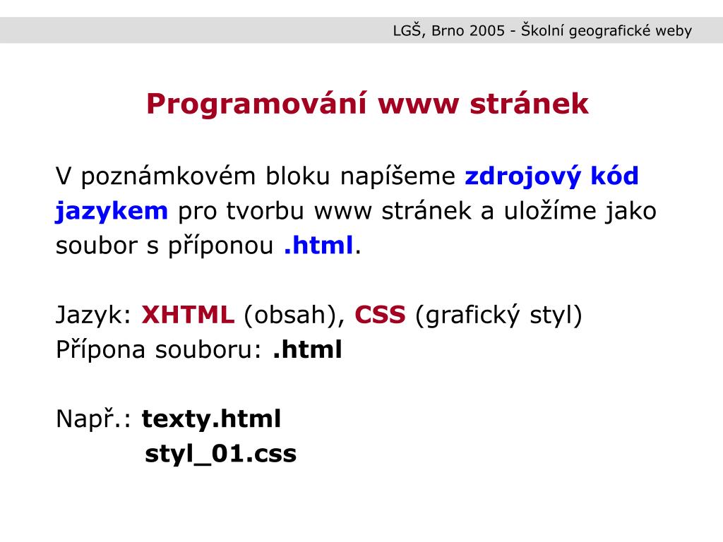 LGŠ, Brno 2005 - Školní geografické weby Programování www stránek V poznámkovém bloku napíšeme zdrojový kódjazykem pro tvorbu www stránek a uložíme jako soubor s příponou .html. Jazyk: XHTML(obsah), CSS (grafický styl) Přípona souboru: .html Např.: texty.html styl_01.css