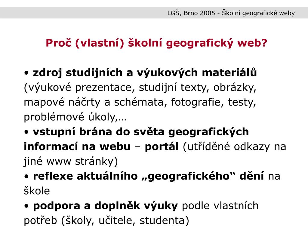 LGŠ, Brno 2005 - Školní geografické weby • Proč (vlastní) školní geografický web? • zdroj studijních a výukových materiálů (výukové prezentace, studijní texty, obrázky, mapové náčrty a schémata, fotografie, testy, problémové úkoly,… • vstupní brána do světa geografických informací na webu – portál (utříděné odkazy na jiné www stránky) • reflexe aktuálního „geografického“ dění na škole • podpora a doplněk výuky podle vlastních potřeb (školy, učitele, studenta)