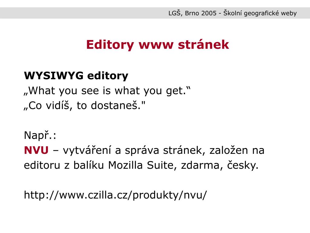 LGŠ, Brno 2005 - Školní geografické weby Editory www stránek WYSIWYG editory „What you see is what you get.“ „Co vidíš, to dostaneš." Např.: NVU – vytváření a správa stránek, založen na editoru z balíku Mozilla Suite, zdarma, česky. http://www.czilla.cz/produkty/nvu/