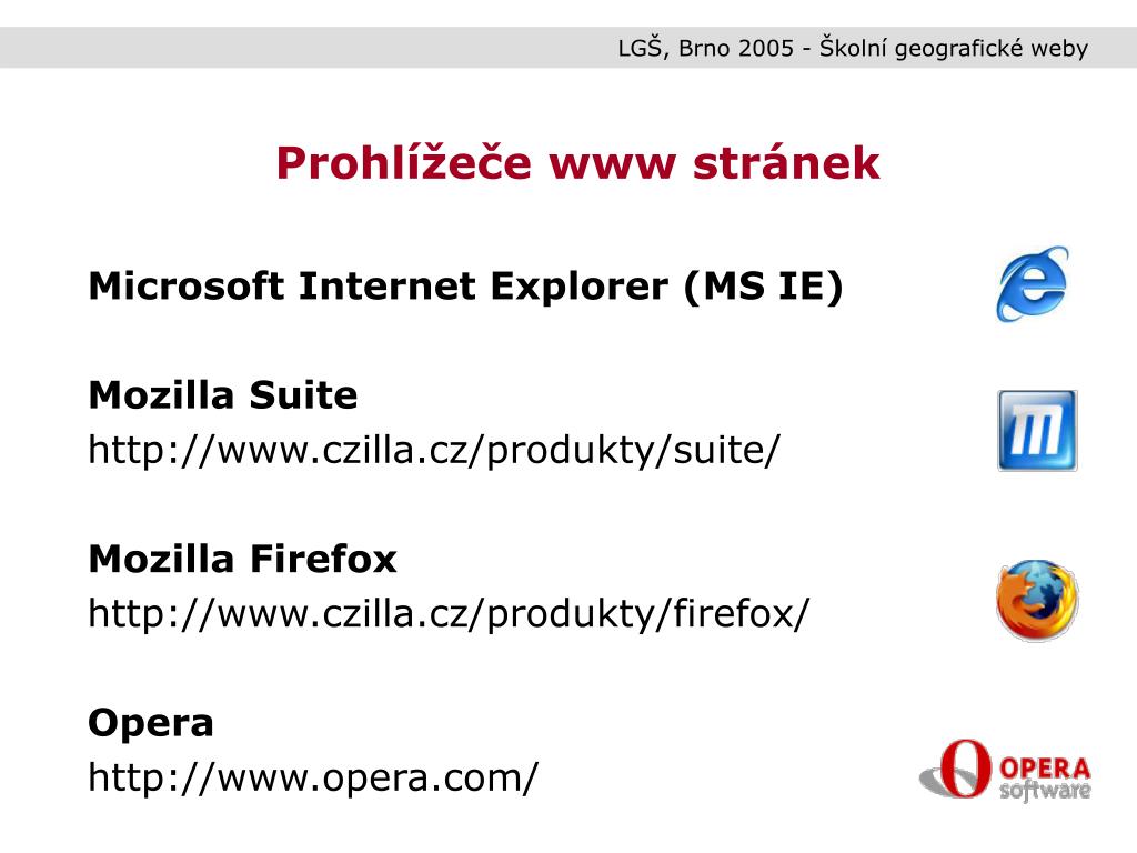 LGŠ, Brno 2005 - Školní geografické weby Prohlížeče www stránek Microsoft Internet Explorer (MS IE) Mozilla Suite http://www.czilla.cz/produkty/suite/ Mozilla Firefox http://www.czilla.cz/produkty/firefox/ Opera http://www.opera.com/