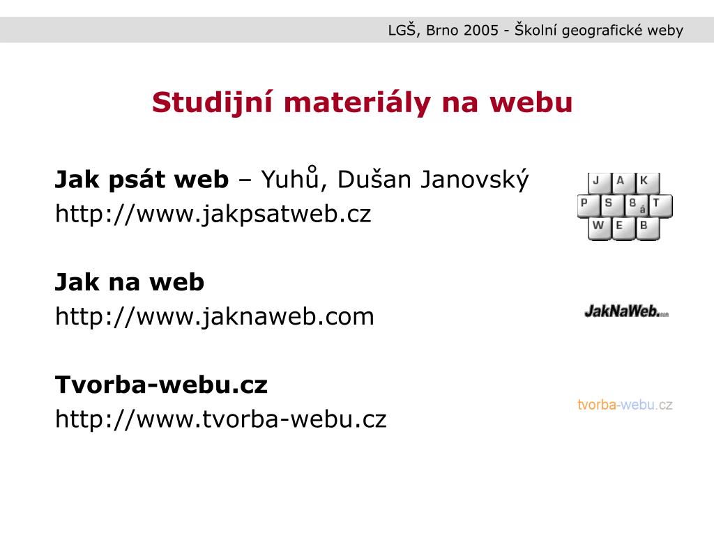 LGŠ, Brno 2005 - Školní geografické weby Studijní materiály na webu Jak psát web – Yuhů, Dušan Janovský http://www.jakpsatweb.cz Jak na web http://www.jaknaweb.com Tvorba-webu.cz http://www.tvorba-webu.cz