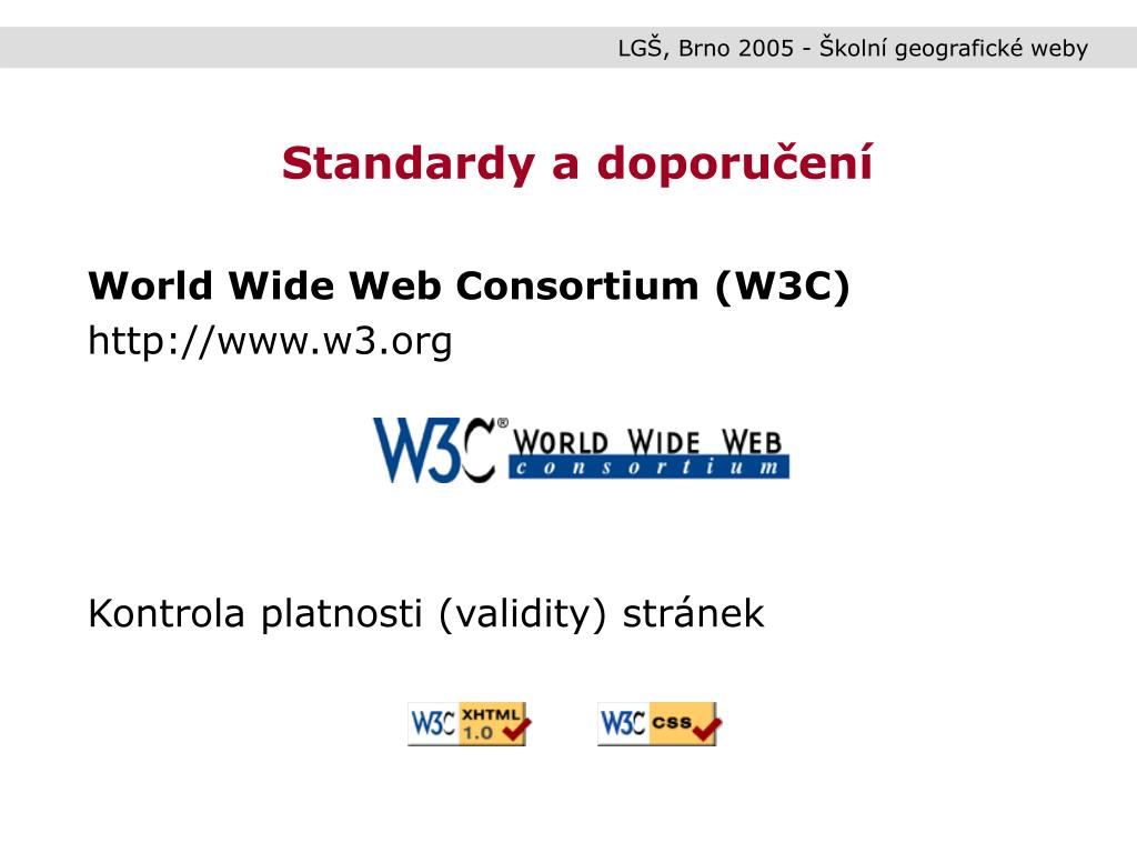 LGŠ, Brno 2005 - Školní geografické weby Standardy a doporučení World Wide Web Consortium (W3C) http://www.w3.org Kontrola platnosti (validity) stránek