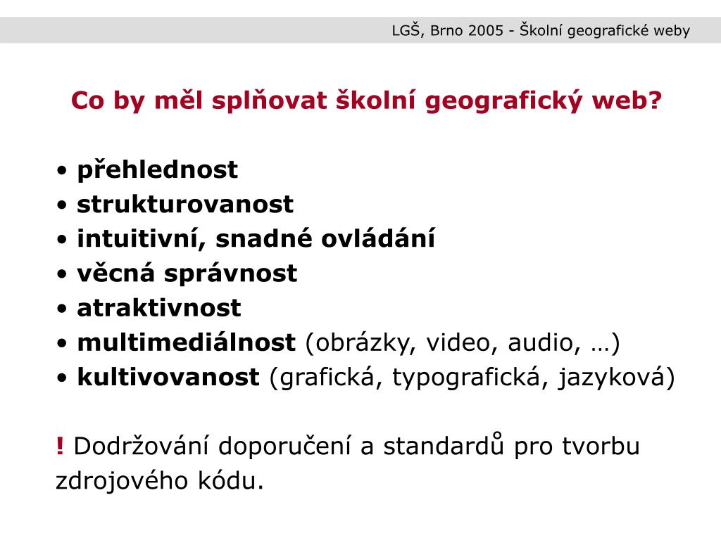 LGŠ, Brno 2005 - Školní geografické weby • Co by měl splňovat školní geografický web? • přehlednost • strukturovanost • intuitivní, snadné ovládání • věcná správnost • atraktivnost • multimediálnost (obrázky, video, audio, …) • kultivovanost (grafická, typografická, jazyková) • !Dodržování doporučení a standardů pro tvorbu zdrojového kódu.