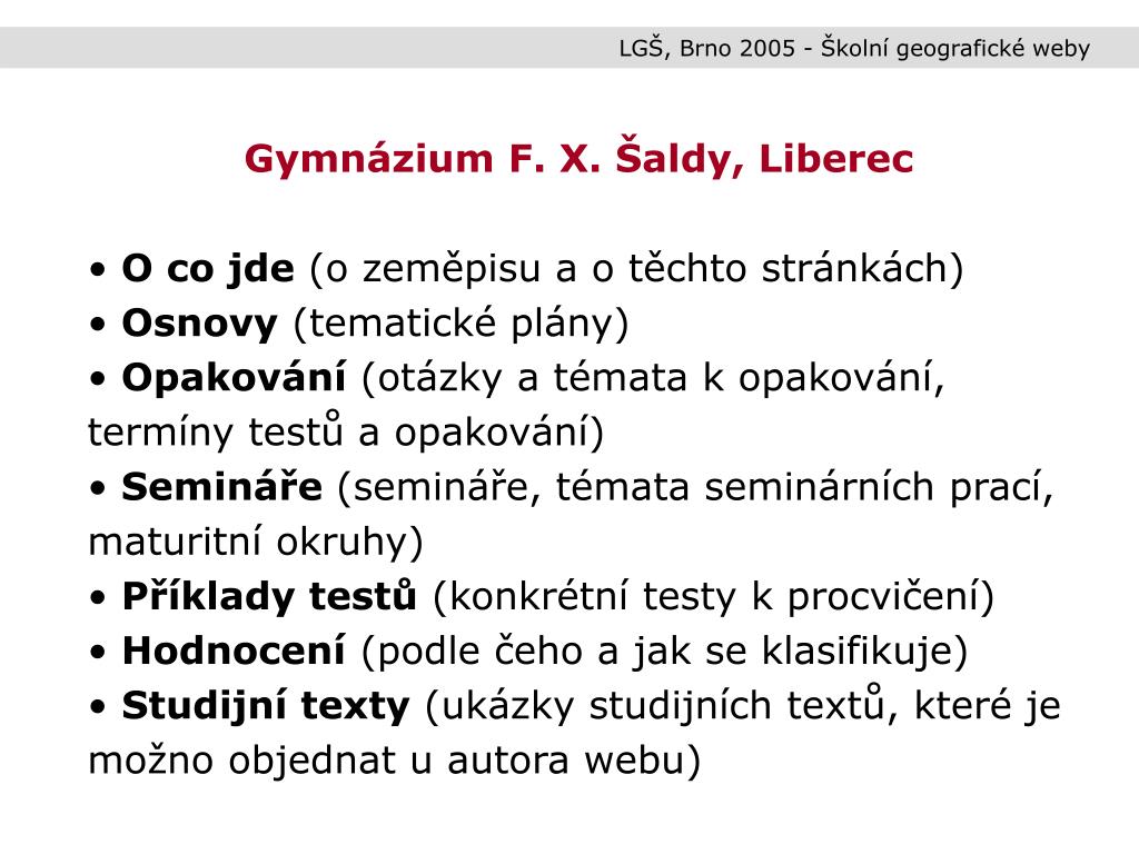 LGŠ, Brno 2005 - Školní geografické weby • Gymnázium F. X. Šaldy, Liberec • O co jde (o zeměpisu a o těchto stránkách) • Osnovy (tematické plány) • Opakování (otázky a témata k opakování, termíny testů a opakování) • Semináře (semináře, témata seminárních prací, maturitní okruhy) • Příklady testů (konkrétní testy k procvičení) • Hodnocení (podle čeho a jak se klasifikuje) • Studijní texty (ukázky studijních textů, které je možno objednat u autora webu)