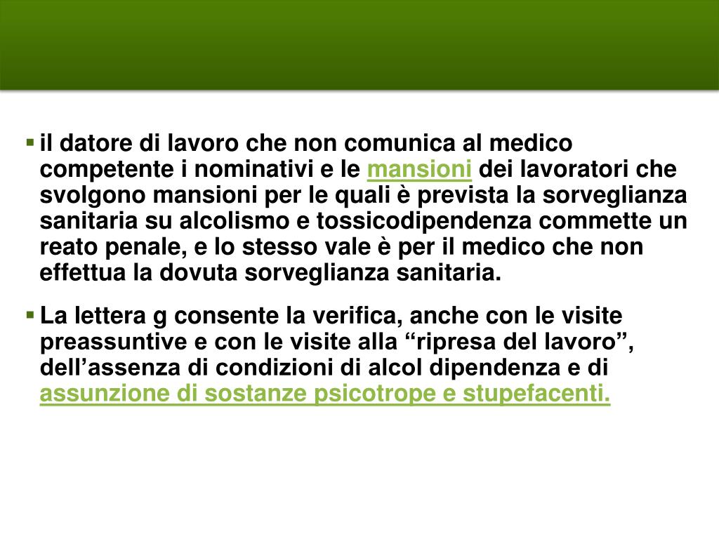 il datore di lavoro che non comunica al medico competente i nominativi e le mansioni dei lavoratori che svolgono mansioni per le quali è prevista la sorveglianza sanitaria su alcolismo e tossicodipendenza commette un reato penale, e lo stesso vale è per il medico che non effettua la dovuta sorveglianza sanitaria. • La lettera g consente la verifica, anche con le visite preassuntive e con le visite alla “ripresa del lavoro”, dell’assenza di condizioni di alcol dipendenza e di assunzione di sostanze psicotrope e stupefacenti.