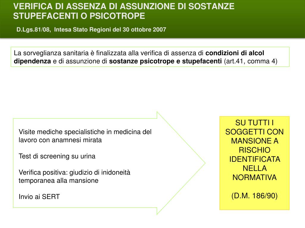 VERIFICA DI ASSENZA DI ASSUNZIONE DI SOSTANZE STUPEFACENTI O PSICOTROPED.Lgs.81/08,Intesa Stato Regioni del 30 ottobre 2007 La sorveglianza sanitaria è finalizzata alla verifica di assenza di condizioni di alcol dipendenza e di assunzione di sostanze psicotrope e stupefacenti (art.41, comma 4) SU TUTTI I SOGGETTI CON MANSIONE A RISCHIO IDENTIFICATA NELLA NORMATIVA (D.M. 186/90) Visite mediche specialistiche in medicina del lavoro con anamnesi mirata Test di screening su urina Verifica positiva: giudizio di inidoneità temporanea alla mansione Invio ai SERT