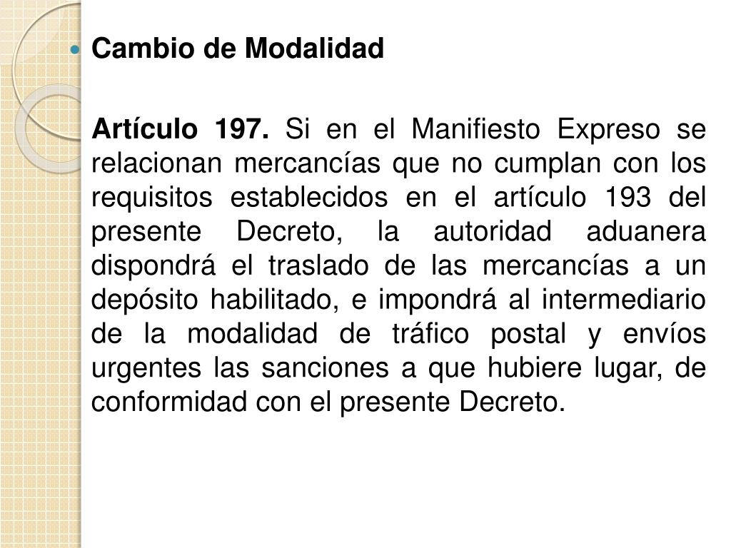 Cambio de Modalidad Artículo 197. Si en el Manifiesto Expreso se relacionan mercancías que no cumplan con los requisitos establecidos en el artículo 193 del presente Decreto, la autoridad aduanera dispondrá el traslado de las mercancías a un depósito habilitado, e impondrá al intermediario de la modalidad de tráfico postal y envíos urgentes las sanciones a que hubiere lugar, de conformidad con el presente Decreto.
