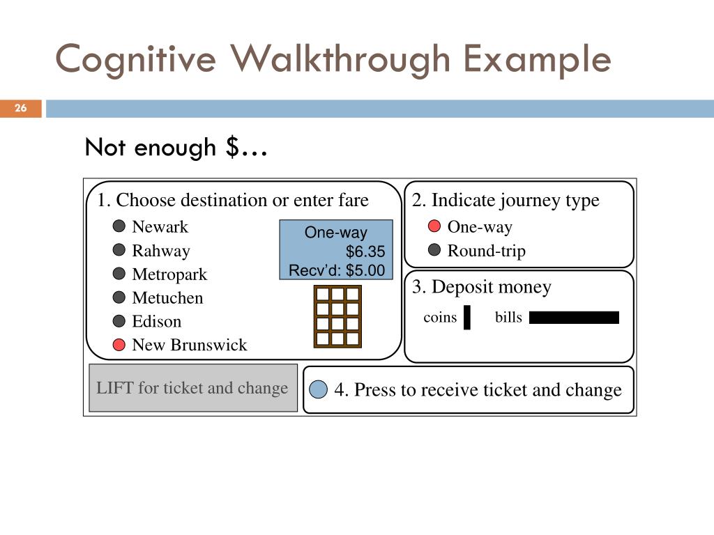 1. Will the correct action be evident to the user? Cognitive Walkthrough Example Yes 1. Choose destination or enter fare Newark Rahway Metropark Metuchen Edison New Brunswick 2. Indicate journey type One-way Round-trip 3. Deposit money coins bills LIFT for ticket and change 4. Press to receive ticket and change