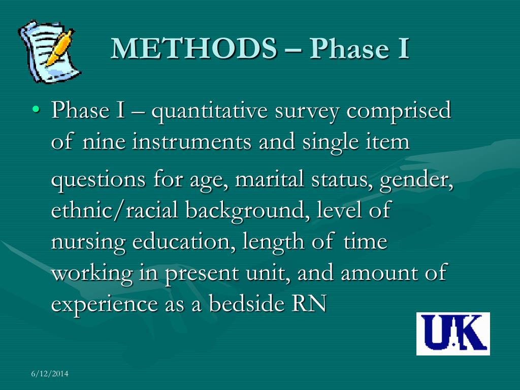 METHODS – Phase I • Phase I – quantitative survey comprised of nine instruments and single item questions for age, marital status, gender, ethnic/racial background, level of nursing education, length of time working in present unit, and amount of experience as a bedside RN