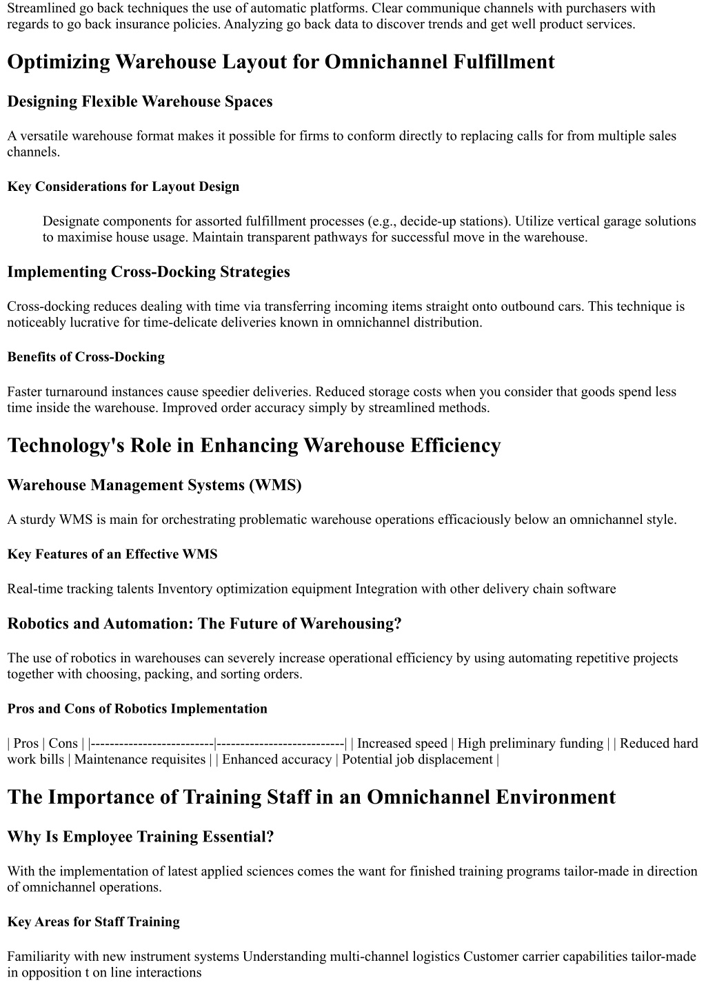 Streamlined go back techniques the use of automatic platforms. Clear communique channels with purchasers with regards to go back insurance policies. Analyzing go back data to discover trends and get well product services. Optimizing Warehouse Layout for Omnichannel Fulfillment Designing Flexible Warehouse Spaces A versatile warehouse format makes it possible for firms to conform directly to replacing calls for from multiple sales channels. Key Considerations for Layout Design Designate components for assorted fulfillment processes (e.g., decide-up stations). Utilize vertical garage solutions to maximise house usage. Maintain transparent pathways for successful move in the warehouse. Implementing Cross-Docking Strategies Cross-docking reduces dealing with time via transferring incoming items straight onto outbound cars. This technique is noticeably lucrative for time-delicate deliveries known in omnichannel distribution. Benefits of Cross-Docking Faster turnaround instances cause speedier deliveries. Reduced storage costs when you consider that goods spend less time inside the warehouse. Improved order accuracy simply by streamlined methods. Technology's Role in Enhancing Warehouse Efficiency Warehouse Management Systems (WMS) A sturdy WMS is main for orchestrating problematic warehouse operations efficaciously below an omnichannel style. Key Features of an Effective WMS Real-time tracking talents Inventory optimization equipment Integration with other delivery chain software Robotics and Automation: The Future of Warehousing? The use of robotics in warehouses can severely increase operational efficiency by using automating repetitive projects together with choosing, packing, and sorting orders. Pros and Cons of Robotics Implementation | Pros | Cons | |--------------------------|---------------------------| | Increased speed | High preliminary funding | | Reduced hard work bills | Maintenance requisites | | Enhanced accuracy | Potential job displacement | The Importance of Training Staff in an Omnichannel Environment Why Is Employee Training Essential? With the implementation of latest applied sciences comes the want for finished training programs tailor-made in direction of omnichannel operations. Key Areas for Staff Training Familiarity with new instrument systems Understanding multi-channel logistics Customer carrier capabilities tailor-made in opposition t on line interactions