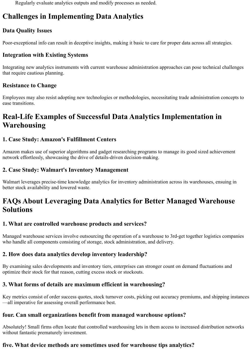 Regularly evaluate analytics outputs and modify processes as needed. Challenges in Implementing Data Analytics Data Quality Issues Poor-exceptional info can result in deceptive insights, making it basic to care for proper data across all strategies. Integration with Existing Systems Integrating new analytics instruments with current warehouse administration approaches can pose technical challenges that require cautious planning. Resistance to Change Employees may also resist adopting new technologies or methodologies, necessitating trade administration concepts to ease transitions. Real-Life Examples of Successful Data Analytics Implementation in Warehousing 1. Case Study: Amazon's Fulfillment Centers Amazon makes use of superior algorithms and gadget researching programs to manage its good sized achievement network effortlessly, showcasing the drive of details-driven decision-making. 2. Case Study: Walmart's Inventory Management Walmart leverages precise-time knowledge analytics for inventory administration across its warehouses, ensuing in better stock availability and lowered waste. FAQs About Leveraging Data Analytics for Better Managed Warehouse Solutions 1. What are controlled warehouse products and services? Managed warehouse services involve outsourcing the operation of a warehouse to 3rd-get together logistics companies who handle all components consisting of storage, stock administration, and delivery. 2. How does data analytics develop inventory leadership? By examining sales developments and inventory tiers, enterprises can stronger count on demand fluctuations and optimize their stock for that reason, cutting excess stock or stockouts. 3. What forms of details are maximum efficient in warehousing? Key metrics consist of order success quotes, stock turnover costs, picking out accuracy premiums, and shipping instances —all imperative for assessing overall performance best. four. Can small organizations benefit from managed warehouse options? Absolutely! Small firms often locate that controlled warehousing lets in them access to increased distribution networks without fantastic prematurely investment. five. What device methods are sometimes used for warehouse tips analytics?