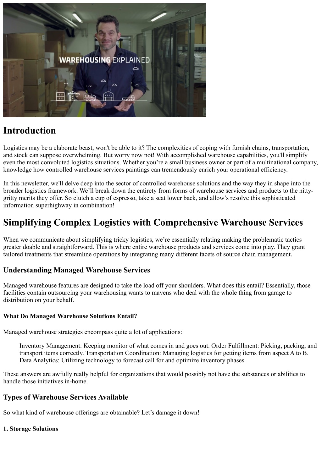 Introduction Logistics may be a elaborate beast, won't be able to it? The complexities of coping with furnish chains, transportation, and stock can suppose overwhelming. But worry now not! With accomplished warehouse capabilities, you'll simplify even the most convoluted logistics situations. Whether you’re a small business owner or part of a multinational company, knowledge how controlled warehouse services paintings can tremendously enrich your operational efficiency. In this newsletter, we'll delve deep into the sector of controlled warehouse solutions and the way they in shape into the broader logistics framework. We’ll break down the entirety from forms of warehouse services and products to the nitty- gritty merits they offer. So clutch a cup of espresso, take a seat lower back, and allow’s resolve this sophisticated information superhighway in combination! Simplifying Complex Logistics with Comprehensive Warehouse Services When we communicate about simplifying tricky logistics, we’re essentially relating making the problematic tactics greater doable and straightforward. This is where entire warehouse products and services come into play. They grant tailored treatments that streamline operations by integrating many different facets of source chain management. Understanding Managed Warehouse Services Managed warehouse features are designed to take the load off your shoulders. What does this entail? Essentially, those facilities contain outsourcing your warehousing wants to mavens who deal with the whole thing from garage to distribution on your behalf. What Do Managed Warehouse Solutions Entail? Managed warehouse strategies encompass quite a lot of applications: Inventory Management: Keeping monitor of what comes in and goes out. Order Fulfillment: Picking, packing, and transport items correctly. Transportation Coordination: Managing logistics for getting items from aspect A to B. Data Analytics: Utilizing technology to forecast call for and optimize inventory phases. These answers are awfully really helpful for organizations that would possibly not have the substances or abilities to handle those initiatives in-home. Types of Warehouse Services Available So what kind of warehouse offerings are obtainable? Let’s damage it down! 1. Storage Solutions
