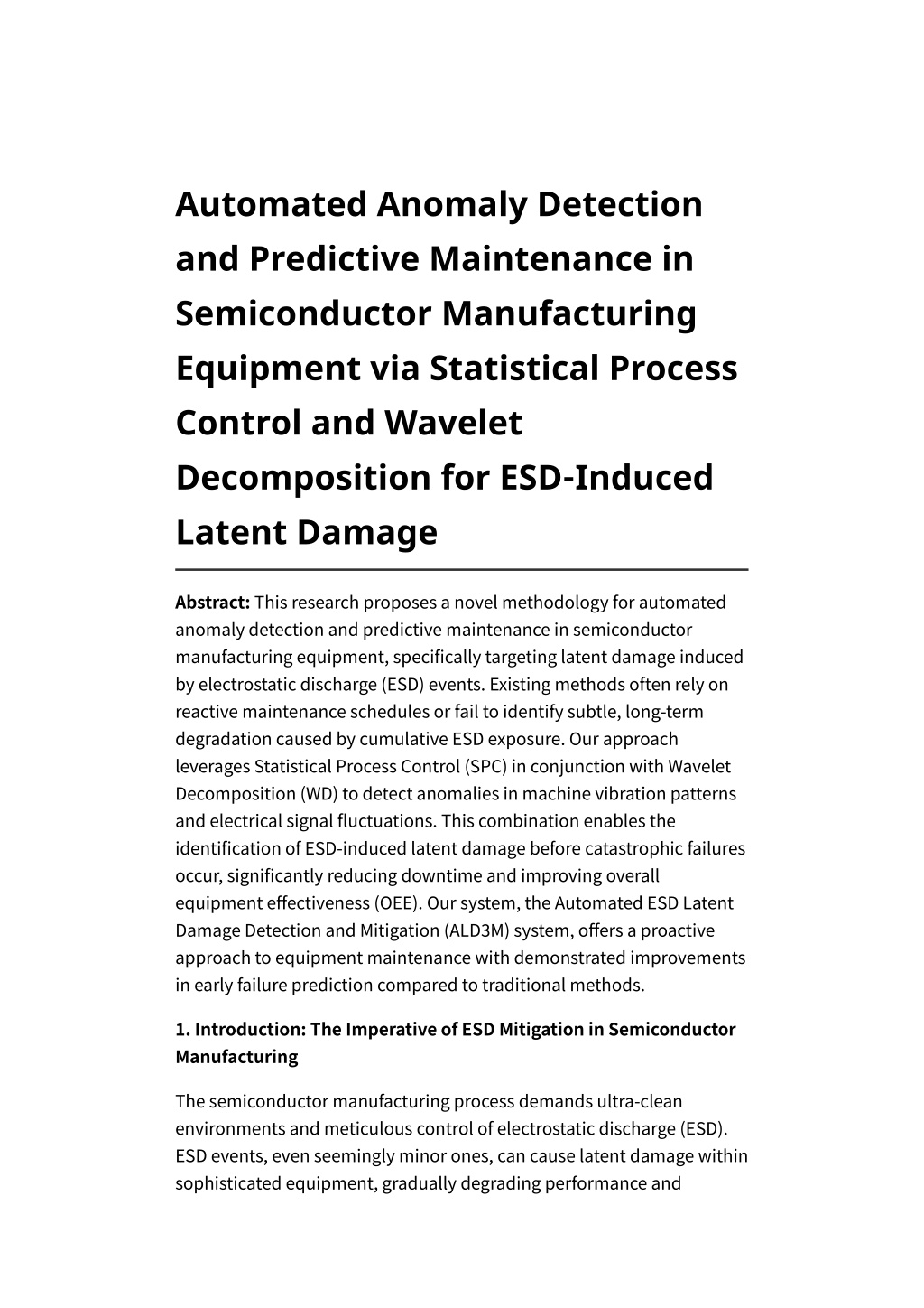 increasing the risk of costly failures. Traditional maintenance schedules often prove ineffective in addressing this gradual damage, leading to unscheduled downtime and reduced yields. Addressing this challenge necessitates the development of advanced anomaly detection systems capable of identifying subtle deviations from normal operation indicative of ESD-induced degradation. This research explores a combined SPC and WD approach aimed at achieving this goal. 2. Literature Review and Problem Statement Previous research on equipment health monitoring has largely focused on vibration analysis and SPC. SPC techniques, such as control charts, have been effectively used to track process stability and detect deviations. However, ESD-induced damage often manifests as subtle, high-frequency vibrations or electrical noise that are difficult to discern using conventional SPC methods. Wavelet decomposition provides a powerful tool for analyzing signals at different scales, isolating high- frequency components often associated with ESD events. However, direct application of WD without statistical context can lead to false positives. This research addresses the limitations of existing approaches by integrating SPC and WD for enhanced anomaly detection precision. 3. Methodology: ALD3M – Automated ESD Latent Damage Detection and Mitigation The ALD3M system leverages a three-stage process: data acquisition, signal processing, and predictive modelling. • 3.1 Data Acquisition: Real-time data is collected from vibration sensors and electrical sensors strategically placed on critical equipment components (e.g., robotic arms, plasma chambers). Data is sampled at 10 kHz with 16-bit resolution. Noise reduction techniques, like Kalman filtering, are applied during data acquisition to improve signal-to-noise ratio. 3.2 Signal Processing – Statistical Process Control & Wavelet Decomposition: SPC Stage: Rolling statistical parameters (mean, standard deviation, skewness, kurtosis) are calculated for short time windows (e.g., 10 seconds). Control charts (e.g., Shewhart, EWMA) are used to establish baseline performance and monitor for deviations. WD Stage: Discrete Wavelet Transform (DWT) is applied to the time-domain signal. Specifically, a Daubechies 4 (db4) • ◦ ◦