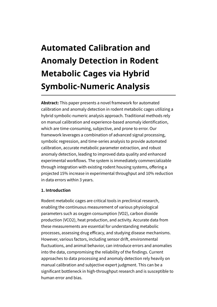 terms of calibration accuracy (RMSE), anomaly detection sensitivity and specificity, and the time required for data processing. Statistical analysis (ANOVA) will be performed to compare the performance of the automated framework with the manual approach. 7. Scalability and Commercialization Roadmap • Short-term (1-2 years): Integrate the framework with existing hardware and software platforms. Develop user-friendly interface for data visualization and control. Initial rollout to core research facilities. Mid-term (3-5 years): Expand the system’s capabilities to support multi-cage experiments, automated experimental design, and real-time data analysis for adaptive interventions. Long-term (5-10 years): Develop a cloud-based platform for data storage, analysis, and sharing. Integrate with machine learning algorithms for personalized metabolic profiling and predictive modeling, equipping users with proactive predictive modeling for anticipated results. • • 8. Conclusion The proposed framework offers a transformative approach to data acquisition and analysis in rodent metabolic cages. By automating calibration and anomaly detection and by integrating symbolic reasoning and meta-self-evaluation, it aims to enhance data quality, improve experimental efficiency, and empower scientists to gain deeper insights into metabolic processes. Its commercial readiness, combinatorial robustness, and comprehensive evaluation make it a high-impact addition to the growing landscape of preclinical research tools. 9. Math formulas Appendix Gaussian Process Regression: f(x) = k(x, x') * K^-1(x') Where: • • f(x) : Predicted VO2 value for input x . k(x, x') : Kernel function (e.g., RBF kernel). Lean4 Symbolic Reasoning to check stoichiometry: