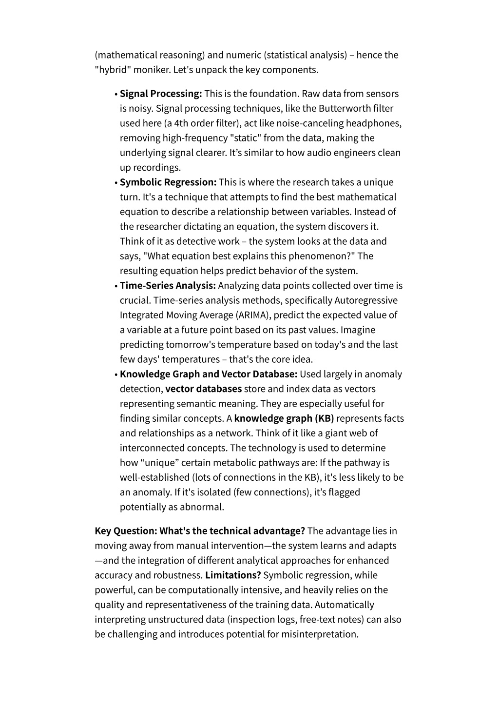 (mathematical reasoning) and numeric (statistical analysis) – hence the "hybrid" moniker. Let's unpack the key components. • Signal Processing: This is the foundation. Raw data from sensors is noisy. Signal processing techniques, like the Butterworth filter used here (a 4th order filter), act like noise-canceling headphones, removing high-frequency "static" from the data, making the underlying signal clearer. It’s similar to how audio engineers clean up recordings. Symbolic Regression: This is where the research takes a unique turn. It's a technique that attempts to find the best mathematical equation to describe a relationship between variables. Instead of the researcher dictating an equation, the system discovers it. Think of it as detective work – the system looks at the data and says, "What equation best explains this phenomenon?" The resulting equation helps predict behavior of the system. Time-Series Analysis: Analyzing data points collected over time is crucial. Time-series analysis methods, specifically Autoregressive Integrated Moving Average (ARIMA), predict the expected value of a variable at a future point based on its past values. Imagine predicting tomorrow's temperature based on today's and the last few days' temperatures – that's the core idea. Knowledge Graph and Vector Database: Used largely in anomaly detection, vector databases store and index data as vectors representing semantic meaning. They are especially useful for finding similar concepts. A knowledge graph (KB) represents facts and relationships as a network. Think of it like a giant web of interconnected concepts. The technology is used to determine how “unique” certain metabolic pathways are: If the pathway is well-established (lots of connections in the KB), it's less likely to be an anomaly. If it's isolated (few connections), it’s flagged potentially as abnormal. • • • Key Question: What's the technical advantage? The advantage lies in moving away from manual intervention—the system learns and adapts —and the integration of different analytical approaches for enhanced accuracy and robustness. Limitations? Symbolic regression, while powerful, can be computationally intensive, and heavily relies on the quality and representativeness of the training data. Automatically interpreting unstructured data (inspection logs, free-text notes) can also be challenging and introduces potential for misinterpretation.