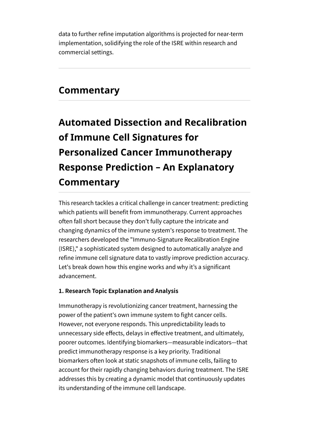 data to further refine imputation algorithms is projected for near-term implementation, solidifying the role of the ISRE within research and commercial settings. Commentary Automated Dissection and Recalibration of Immune Cell Signatures for Personalized Cancer Immunotherapy Response Prediction – An Explanatory Commentary This research tackles a critical challenge in cancer treatment: predicting which patients will benefit from immunotherapy. Current approaches often fall short because they don’t fully capture the intricate and changing dynamics of the immune system's response to treatment. The researchers developed the "Immuno-Signature Recalibration Engine (ISRE)," a sophisticated system designed to automatically analyze and refine immune cell signature data to vastly improve prediction accuracy. Let's break down how this engine works and why it’s a significant advancement. 1. Research Topic Explanation and Analysis Immunotherapy is revolutionizing cancer treatment, harnessing the power of the patient's own immune system to fight cancer cells. However, not everyone responds. This unpredictability leads to unnecessary side effects, delays in effective treatment, and ultimately, poorer outcomes. Identifying biomarkers—measurable indicators—that predict immunotherapy response is a key priority. Traditional biomarkers often look at static snapshots of immune cells, failing to account for their rapidly changing behaviors during treatment. The ISRE addresses this by creating a dynamic model that continuously updates its understanding of the immune cell landscape.
