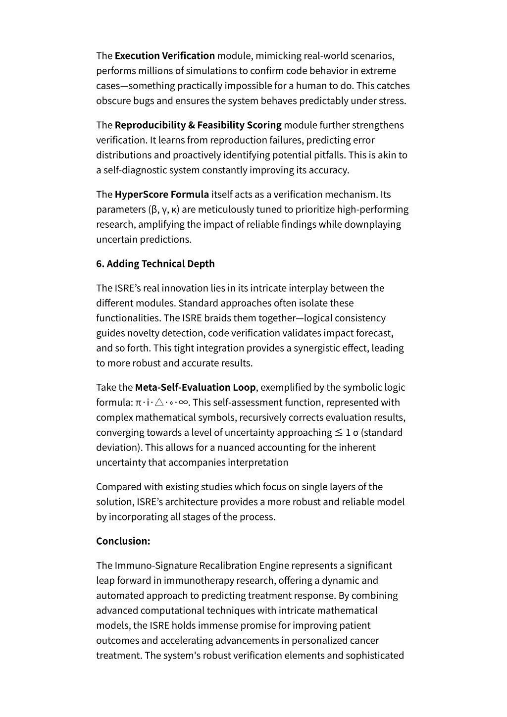 The Execution Verification module, mimicking real-world scenarios, performs millions of simulations to confirm code behavior in extreme cases—something practically impossible for a human to do. This catches obscure bugs and ensures the system behaves predictably under stress. The Reproducibility & Feasibility Scoring module further strengthens verification. It learns from reproduction failures, predicting error distributions and proactively identifying potential pitfalls. This is akin to a self-diagnostic system constantly improving its accuracy. The HyperScore Formula itself acts as a verification mechanism. Its parameters (β, γ, κ) are meticulously tuned to prioritize high-performing research, amplifying the impact of reliable findings while downplaying uncertain predictions. 6. Adding Technical Depth The ISRE’s real innovation lies in its intricate interplay between the different modules. Standard approaches often isolate these functionalities. The ISRE braids them together—logical consistency guides novelty detection, code verification validates impact forecast, and so forth. This tight integration provides a synergistic effect, leading to more robust and accurate results. Take the Meta-Self-Evaluation Loop, exemplified by the symbolic logic formula: π·i·△·⋄·∞. This self-assessment function, represented with complex mathematical symbols, recursively corrects evaluation results, converging towards a level of uncertainty approaching ≤ 1 σ (standard deviation). This allows for a nuanced accounting for the inherent uncertainty that accompanies interpretation Compared with existing studies which focus on single layers of the solution, ISRE’s architecture provides a more robust and reliable model by incorporating all stages of the process. Conclusion: The Immuno-Signature Recalibration Engine represents a significant leap forward in immunotherapy research, offering a dynamic and automated approach to predicting treatment response. By combining advanced computational techniques with intricate mathematical models, the ISRE holds immense promise for improving patient outcomes and accelerating advancements in personalized cancer treatment. The system's robust verification elements and sophisticated