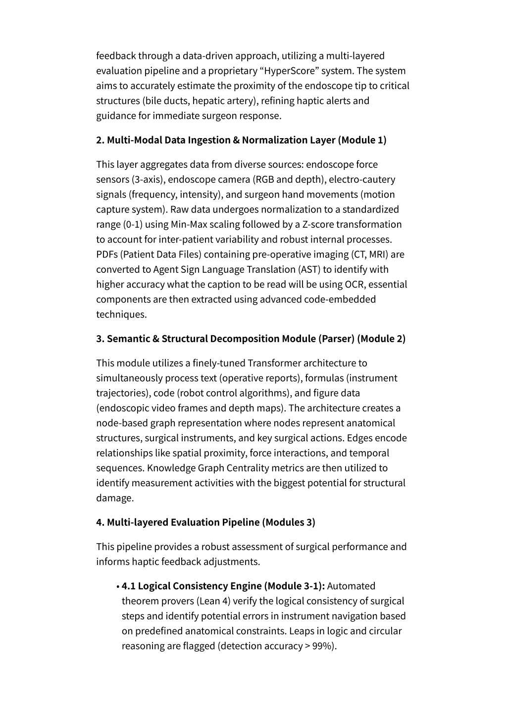 feedback through a data-driven approach, utilizing a multi-layered evaluation pipeline and a proprietary “HyperScore” system. The system aims to accurately estimate the proximity of the endoscope tip to critical structures (bile ducts, hepatic artery), refining haptic alerts and guidance for immediate surgeon response. 2. Multi-Modal Data Ingestion & Normalization Layer (Module 1) This layer aggregates data from diverse sources: endoscope force sensors (3-axis), endoscope camera (RGB and depth), electro-cautery signals (frequency, intensity), and surgeon hand movements (motion capture system). Raw data undergoes normalization to a standardized range (0-1) using Min-Max scaling followed by a Z-score transformation to account for inter-patient variability and robust internal processes. PDFs (Patient Data Files) containing pre-operative imaging (CT, MRI) are converted to Agent Sign Language Translation (AST) to identify with higher accuracy what the caption to be read will be using OCR, essential components are then extracted using advanced code-embedded techniques. 3. Semantic & Structural Decomposition Module (Parser) (Module 2) This module utilizes a finely-tuned Transformer architecture to simultaneously process text (operative reports), formulas (instrument trajectories), code (robot control algorithms), and figure data (endoscopic video frames and depth maps). The architecture creates a node-based graph representation where nodes represent anatomical structures, surgical instruments, and key surgical actions. Edges encode relationships like spatial proximity, force interactions, and temporal sequences. Knowledge Graph Centrality metrics are then utilized to identify measurement activities with the biggest potential for structural damage. 4. Multi-layered Evaluation Pipeline (Modules 3) This pipeline provides a robust assessment of surgical performance and informs haptic feedback adjustments. • 4.1 Logical Consistency Engine (Module 3-1): Automated theorem provers (Lean 4) verify the logical consistency of surgical steps and identify potential errors in instrument navigation based on predefined anatomical constraints. Leaps in logic and circular reasoning are flagged (detection accuracy > 99%).