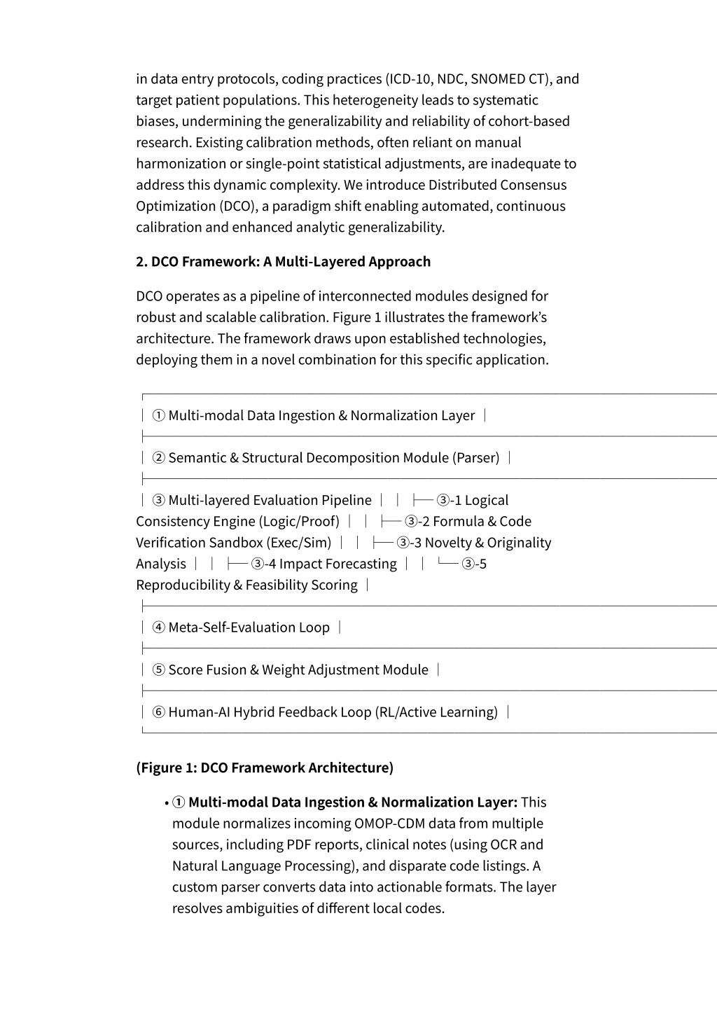 2. in data entry protocols, coding practices (ICD-10, NDC, SNOMED CT), and target patient populations. This heterogeneity leads to systematic biases, undermining the generalizability and reliability of cohort-based research. Existing calibration methods, often reliant on manual harmonization or single-point statistical adjustments, are inadequate to address this dynamic complexity. We introduce Distributed Consensus Optimization (DCO), a paradigm shift enabling automated, continuous calibration and enhanced analytic generalizability. 2. DCO Framework: A Multi-Layered Approach DCO operates as a pipeline of interconnected modules designed for robust and scalable calibration. Figure 1 illustrates the framework’s architecture. The framework draws upon established technologies, deploying them in a novel combination for this specific application. ┌──────────────────────────────────────────────┐ │ ① Multi-modal Data Ingestion & Normalization Layer │ ├──────────────────────────────────────────────┤ │ ② Semantic & Structural Decomposition Module (Parser) │ ├──────────────────────────────────────────────┤ │ ③ Multi-layered Evaluation Pipeline │ │ ├─ ③-1 Logical Consistency Engine (Logic/Proof) │ │ ├─ ③-2 Formula & Code Verification Sandbox (Exec/Sim) │ │ ├─ ③-3 Novelty & Originality Analysis │ │ ├─ ③-4 Impact Forecasting │ │ └─ ③-5 Reproducibility & Feasibility Scoring │ ├──────────────────────────────────────────────┤ │ ④ Meta-Self-Evaluation Loop │ ├──────────────────────────────────────────────┤ │ ⑤ Score Fusion & Weight Adjustment Module │ ├──────────────────────────────────────────────┤ │ ⑥ Human-AI Hybrid Feedback Loop (RL/Active Learning) │ └──────────────────────────────────────────────┘ (Figure 1: DCO Framework Architecture) • ① Multi-modal Data Ingestion & Normalization Layer: This module normalizes incoming OMOP-CDM data from multiple sources, including PDF reports, clinical notes (using OCR and Natural Language Processing), and disparate code listings. A custom parser converts data into actionable formats. The layer resolves ambiguities of different local codes.