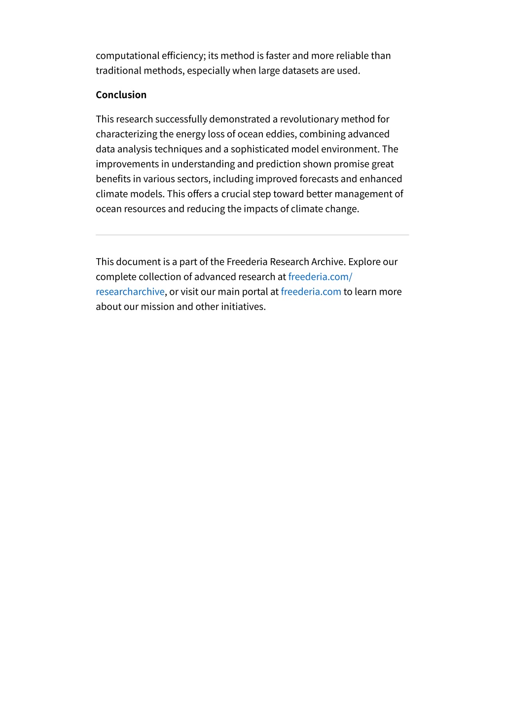 computational efficiency; its method is faster and more reliable than traditional methods, especially when large datasets are used. Conclusion This research successfully demonstrated a revolutionary method for characterizing the energy loss of ocean eddies, combining advanced data analysis techniques and a sophisticated model environment. The improvements in understanding and prediction shown promise great benefits in various sectors, including improved forecasts and enhanced climate models. This offers a crucial step toward better management of ocean resources and reducing the impacts of climate change. This document is a part of the Freederia Research Archive. Explore our complete collection of advanced research at freederia.com/ researcharchive, or visit our main portal at freederia.com to learn more about our mission and other initiatives.
