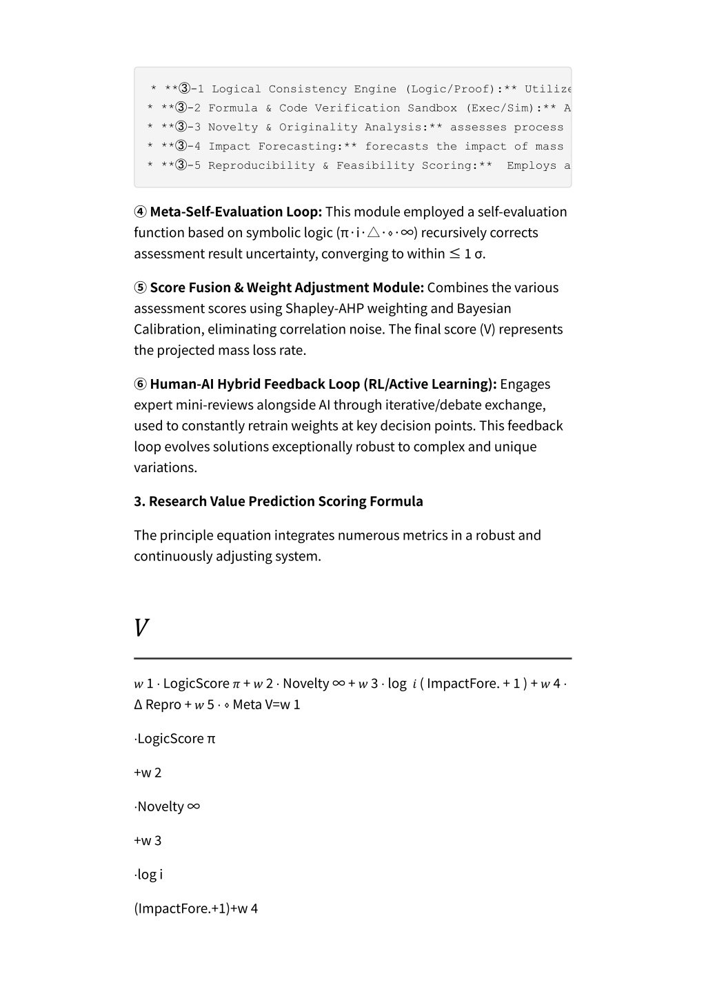 1. Research Topic and Core Technologies MM-RIME’s core objective is accurate mass loss prediction in AM. It achieves this by combining: real-time process data (laser performance, powder bed temperature, camera imagery), material property information, CAD models, and simulation results. Why is this data integration so important? Traditional models often rely on oversimplified assumptions or incomplete data, struggling with complex geometries and materials. Integrating multiple data streams provides a more holistic view, enabling the framework to adapt to varying conditions and predict mass loss with greater accuracy. The “recursive evaluation” component is key—the system learns from its predictions, continuously improving over time. Key technologies include Machine Learning (specifically Reinforcement Learning - RL), Finite Element Analysis (FEA), and sophisticated data processing techniques. RL allows the system to learn optimal control strategies – essentially rewarding accurate predictions and penalizing errors. FEA simulations provide predicted thermal behavior, which is crucial for understanding mass loss. These technologies contribute to state-of-the-art because they move away from static prediction models towards dynamic, learning systems that can adapt to real-time process variations. The large-scale data analysis methods are also advanced, allowing for the processing of immense amounts of data from multiple sources simultaneously. Technical Advantages & Limitations: The significant advantage is the dynamic, adaptive nature of the system. It's not a fixed model but a learning agent. However, this also introduces a limitation: initial training requires substantial data and computational resources. Furthermore, the reliance on accurate material property databases is critical – inaccurate data compromises the prediction quality. 2. Mathematical Models and Algorithms MM-RIME utilizes several mathematical techniques. The crucial equation defining the final score (V) integrates multiple metrics – LogicScore (consistency), Novelty, ImpactForecasting, Repro (Reproducibility), and Meta (self-evaluation). This equation demonstrates a weighted summation, where each term contributes based on its perceived importance. Shapley-AHP weighting and Bayesian Calibration are used to determine these weights, eliminating correlation noise--essentially ensuring the system isn't over-reliant on any single data source.