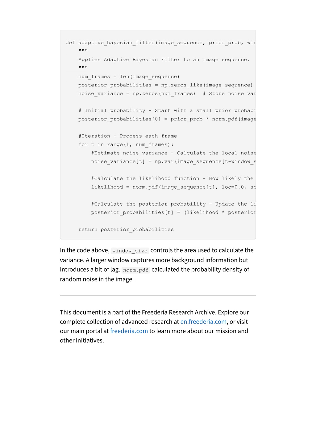 def adaptive_bayesian_filter(image_sequence, prior_prob, window_size): """ Applies Adaptive Bayesian Filter to an image sequence. """ num_frames = len(image_sequence) posterior_probabilities = np.zeros_like(image_sequence) noise_variance = np.zeros(num_frames) # Store noise variance for each frame # Initial probability - Start with a small prior probability of a pore posterior_probabilities[0] = prior_prob * norm.pdf(image_sequence[0], loc=0.0, scale=np.std(image_sequence[0])) #Iteration - Process each frame for t in range(1, num_frames): #Estimate noise variance - Calculate the local noise in the image noise_variance[t] = np.var(image_sequence[t-window_size:t]) #Calculate using variance of nearby pixels. #Calculate the likelihood function - How likely the image signal is to what's expected likelihood = norm.pdf(image_sequence[t], loc=0.0, scale=np.sqrt(noise_variance[t]))#How likely image intensity came from the background noise #Calculate the posterior probability - Update the likelihood based on the prior and noise data posterior_probabilities[t] = (likelihood * posterior_probabilities[t-1]) / np.mean(posterior_probabilities[t-1])#Further correction/ adjustment assuming data set consistency. return posterior_probabilities In the code above, window_size controls the area used to calculate the variance. A larger window captures more background information but introduces a bit of lag. norm.pdf calculated the probability density of random noise in the image. This document is a part of the Freederia Research Archive. Explore our complete collection of advanced research at en.freederia.com, or visit our main portal at freederia.com to learn more about our mission and other initiatives.