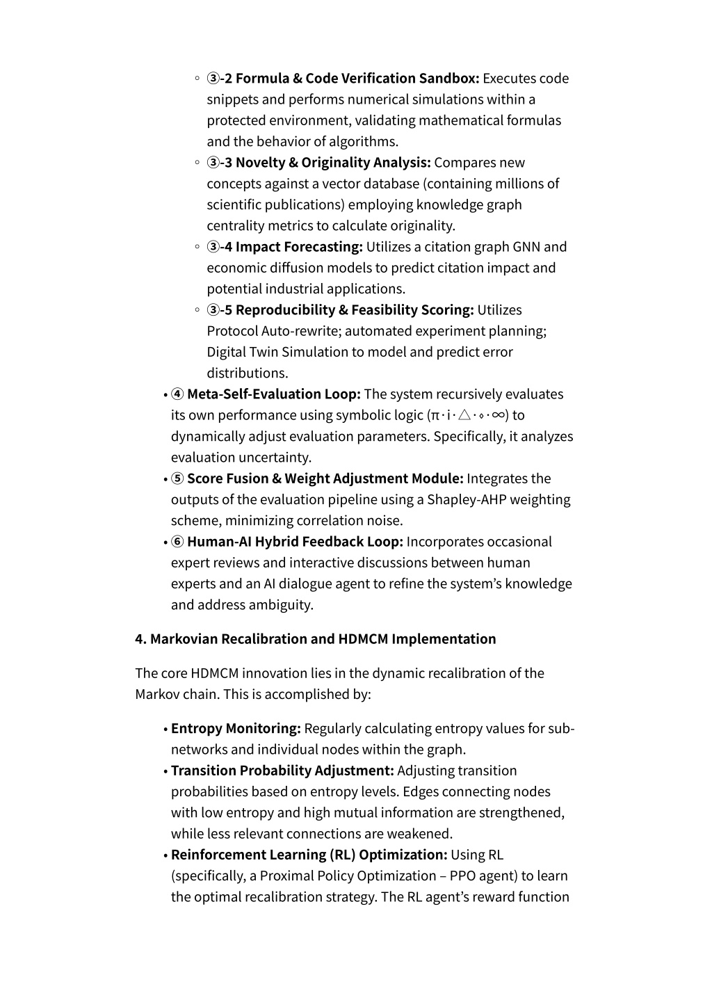 ③-2 Formula & Code Verification Sandbox: Executes code snippets and performs numerical simulations within a protected environment, validating mathematical formulas and the behavior of algorithms. ③-3 Novelty & Originality Analysis: Compares new concepts against a vector database (containing millions of scientific publications) employing knowledge graph centrality metrics to calculate originality. ③-4 Impact Forecasting: Utilizes a citation graph GNN and economic diffusion models to predict citation impact and potential industrial applications. ③-5 Reproducibility & Feasibility Scoring: Utilizes Protocol Auto-rewrite; automated experiment planning; Digital Twin Simulation to model and predict error distributions. ④ Meta-Self-Evaluation Loop: The system recursively evaluates its own performance using symbolic logic (π·i·△·⋄·∞) to dynamically adjust evaluation parameters. Specifically, it analyzes evaluation uncertainty. ⑤ Score Fusion & Weight Adjustment Module: Integrates the outputs of the evaluation pipeline using a Shapley-AHP weighting scheme, minimizing correlation noise. ⑥ Human-AI Hybrid Feedback Loop: Incorporates occasional expert reviews and interactive discussions between human experts and an AI dialogue agent to refine the system’s knowledge and address ambiguity. ◦ ◦ ◦ ◦ • • • 4. Markovian Recalibration and HDMCM Implementation The core HDMCM innovation lies in the dynamic recalibration of the Markov chain. This is accomplished by: • Entropy Monitoring: Regularly calculating entropy values for sub- networks and individual nodes within the graph. Transition Probability Adjustment: Adjusting transition probabilities based on entropy levels. Edges connecting nodes with low entropy and high mutual information are strengthened, while less relevant connections are weakened. Reinforcement Learning (RL) Optimization: Using RL (specifically, a Proximal Policy Optimization – PPO agent) to learn the optimal recalibration strategy. The RL agent’s reward function • •