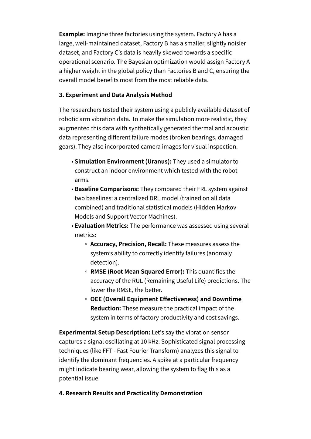 Example: Imagine three factories using the system. Factory A has a large, well-maintained dataset, Factory B has a smaller, slightly noisier dataset, and Factory C’s data is heavily skewed towards a specific operational scenario. The Bayesian optimization would assign Factory A a higher weight in the global policy than Factories B and C, ensuring the overall model benefits most from the most reliable data. 3. Experiment and Data Analysis Method The researchers tested their system using a publicly available dataset of robotic arm vibration data. To make the simulation more realistic, they augmented this data with synthetically generated thermal and acoustic data representing different failure modes (broken bearings, damaged gears). They also incorporated camera images for visual inspection. • Simulation Environment (Uranus): They used a simulator to construct an indoor environment which tested with the robot arms. Baseline Comparisons: They compared their FRL system against two baselines: a centralized DRL model (trained on all data combined) and traditional statistical models (Hidden Markov Models and Support Vector Machines). Evaluation Metrics: The performance was assessed using several metrics: Accuracy, Precision, Recall: These measures assess the system’s ability to correctly identify failures (anomaly detection). RMSE (Root Mean Squared Error): This quantifies the accuracy of the RUL (Remaining Useful Life) predictions. The lower the RMSE, the better. OEE (Overall Equipment Effectiveness) and Downtime Reduction: These measure the practical impact of the system in terms of factory productivity and cost savings. • • ◦ ◦ ◦ Experimental Setup Description: Let's say the vibration sensor captures a signal oscillating at 10 kHz. Sophisticated signal processing techniques (like FFT - Fast Fourier Transform) analyzes this signal to identify the dominant frequencies. A spike at a particular frequency might indicate bearing wear, allowing the system to flag this as a potential issue. 4. Research Results and Practicality Demonstration
