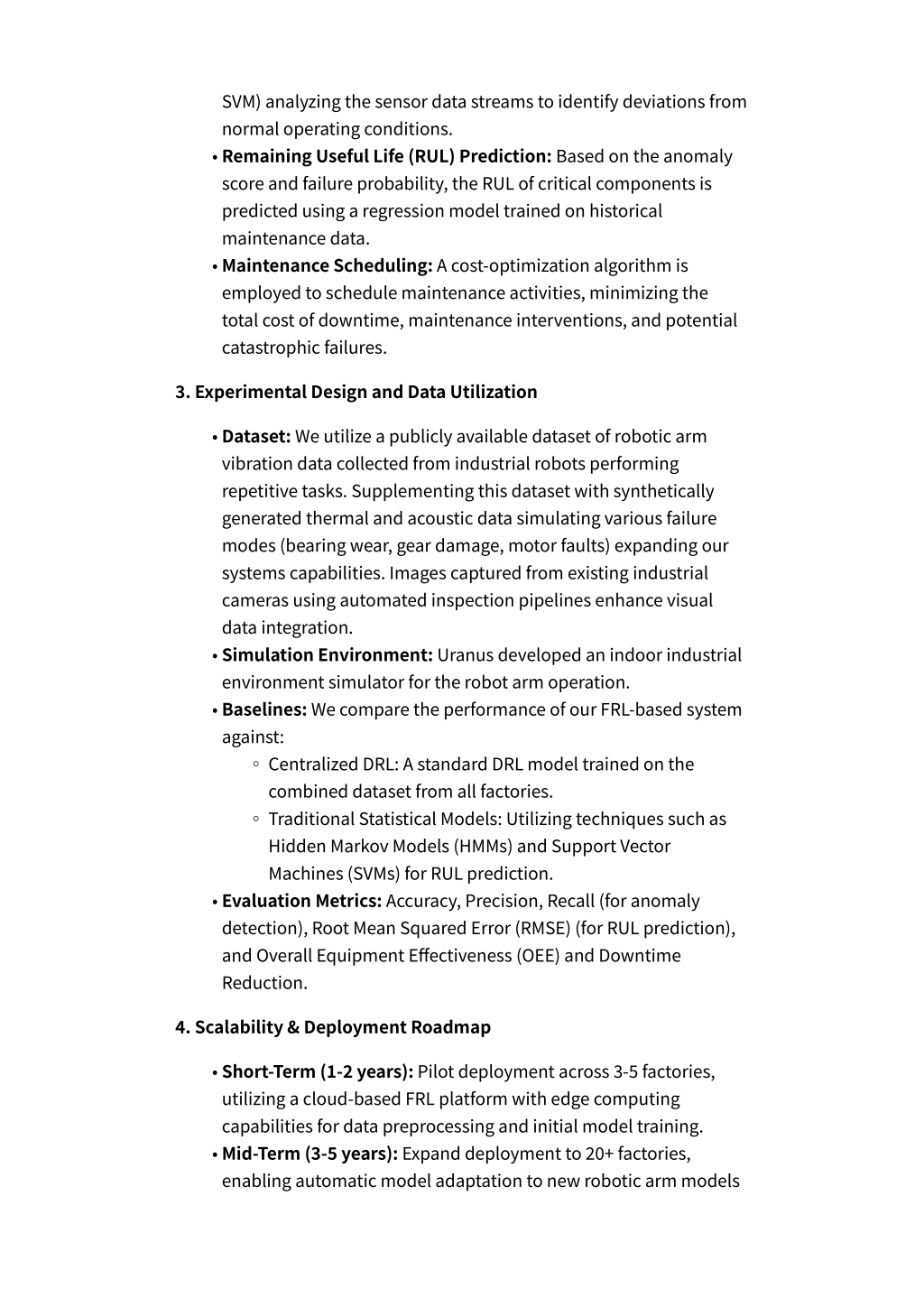 SVM) analyzing the sensor data streams to identify deviations from normal operating conditions. Remaining Useful Life (RUL) Prediction: Based on the anomaly score and failure probability, the RUL of critical components is predicted using a regression model trained on historical maintenance data. Maintenance Scheduling: A cost-optimization algorithm is employed to schedule maintenance activities, minimizing the total cost of downtime, maintenance interventions, and potential catastrophic failures. • • 3. Experimental Design and Data Utilization • Dataset: We utilize a publicly available dataset of robotic arm vibration data collected from industrial robots performing repetitive tasks. Supplementing this dataset with synthetically generated thermal and acoustic data simulating various failure modes (bearing wear, gear damage, motor faults) expanding our systems capabilities. Images captured from existing industrial cameras using automated inspection pipelines enhance visual data integration. Simulation Environment: Uranus developed an indoor industrial environment simulator for the robot arm operation. Baselines: We compare the performance of our FRL-based system against: Centralized DRL: A standard DRL model trained on the combined dataset from all factories. Traditional Statistical Models: Utilizing techniques such as Hidden Markov Models (HMMs) and Support Vector Machines (SVMs) for RUL prediction. Evaluation Metrics: Accuracy, Precision, Recall (for anomaly detection), Root Mean Squared Error (RMSE) (for RUL prediction), and Overall Equipment Effectiveness (OEE) and Downtime Reduction. • • ◦ ◦ • 4. Scalability & Deployment Roadmap • Short-Term (1-2 years): Pilot deployment across 3-5 factories, utilizing a cloud-based FRL platform with edge computing capabilities for data preprocessing and initial model training. Mid-Term (3-5 years): Expand deployment to 20+ factories, enabling automatic model adaptation to new robotic arm models •