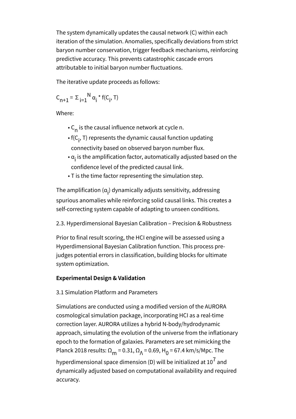 The system dynamically updates the causal network (C) within each iteration of the simulation. Anomalies, specifically deviations from strict baryon number conservation, trigger feedback mechanisms, reinforcing predictive accuracy. This prevents catastrophic cascade errors attributable to initial baryon number fluctuations. The iterative update proceeds as follows: N αi * f(Ci, T) Cn+1 = ∑i=1 Where: • Cn is the causal influence network at cycle n. f(Ci, T) represents the dynamic causal function updating connectivity based on observed baryon number flux. αi is the amplification factor, automatically adjusted based on the confidence level of the predicted causal link. T is the time factor representing the simulation step. • • • The amplification (αi) dynamically adjusts sensitivity, addressing spurious anomalies while reinforcing solid causal links. This creates a self-correcting system capable of adapting to unseen conditions. 2.3. Hyperdimensional Bayesian Calibration – Precision & Robustness Prior to final result scoring, the HCI engine will be assessed using a Hyperdimensional Bayesian Calibration function. This process pre- judges potential errors in classification, building blocks for ultimate system optimization. Experimental Design & Validation 3.1 Simulation Platform and Parameters Simulations are conducted using a modified version of the AURORA cosmological simulation package, incorporating HCI as a real-time correction layer. AURORA utilizes a hybrid N-body/hydrodynamic approach, simulating the evolution of the universe from the inflationary epoch to the formation of galaxies. Parameters are set mimicking the Planck 2018 results: Ωm = 0.31, ΩΛ = 0.69, H0 = 67.4 km/s/Mpc. The hyperdimensional space dimension (D) will be initialized at 107 and dynamically adjusted based on computational availability and required accuracy.