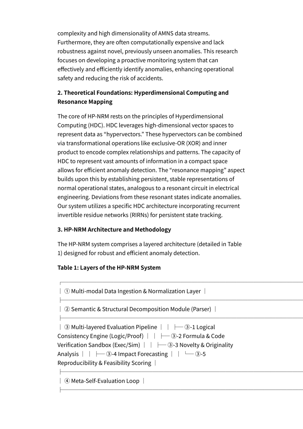complexity and high dimensionality of AMNS data streams. Furthermore, they are often computationally expensive and lack robustness against novel, previously unseen anomalies. This research focuses on developing a proactive monitoring system that can effectively and efficiently identify anomalies, enhancing operational safety and reducing the risk of accidents. 2. Theoretical Foundations: Hyperdimensional Computing and Resonance Mapping The core of HP-NRM rests on the principles of Hyperdimensional Computing (HDC). HDC leverages high-dimensional vector spaces to represent data as “hypervectors.” These hypervectors can be combined via transformational operations like exclusive-OR (XOR) and inner product to encode complex relationships and patterns. The capacity of HDC to represent vast amounts of information in a compact space allows for efficient anomaly detection. The “resonance mapping” aspect builds upon this by establishing persistent, stable representations of normal operational states, analogous to a resonant circuit in electrical engineering. Deviations from these resonant states indicate anomalies. Our system utilizes a specific HDC architecture incorporating recurrent invertible residue networks (RIRNs) for persistent state tracking. 3. HP-NRM Architecture and Methodology The HP-NRM system comprises a layered architecture (detailed in Table 1) designed for robust and efficient anomaly detection. Table 1: Layers of the HP-NRM System ┌──────────────────────────────────────────────────────────┐ │ ① Multi-modal Data Ingestion & Normalization Layer │ ├──────────────────────────────────────────────┤ │ ② Semantic & Structural Decomposition Module (Parser) │ ├──────────────────────────────────────────────┤ │ ③ Multi-layered Evaluation Pipeline │ │ ├─ ③-1 Logical Consistency Engine (Logic/Proof) │ │ ├─ ③-2 Formula & Code Verification Sandbox (Exec/Sim) │ │ ├─ ③-3 Novelty & Originality Analysis │ │ ├─ ③-4 Impact Forecasting │ │ └─ ③-5 Reproducibility & Feasibility Scoring │ ├──────────────────────────────────────────────┤ │ ④ Meta-Self-Evaluation Loop │ ├──────────────────────────────────────────────┤