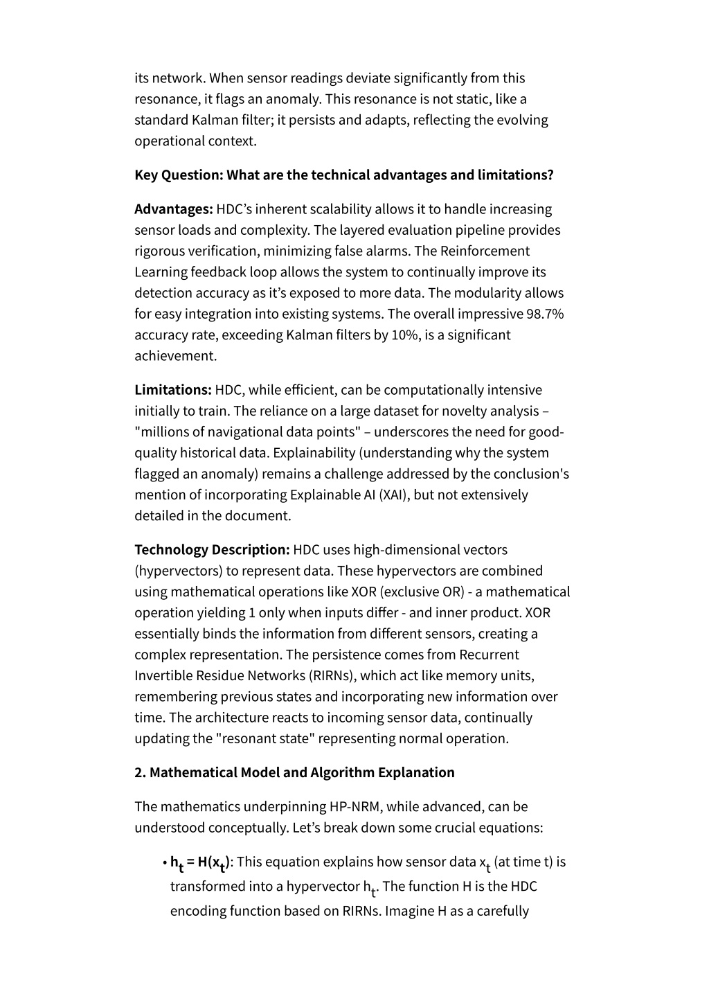 its network. When sensor readings deviate significantly from this resonance, it flags an anomaly. This resonance is not static, like a standard Kalman filter; it persists and adapts, reflecting the evolving operational context. Key Question: What are the technical advantages and limitations? Advantages: HDC’s inherent scalability allows it to handle increasing sensor loads and complexity. The layered evaluation pipeline provides rigorous verification, minimizing false alarms. The Reinforcement Learning feedback loop allows the system to continually improve its detection accuracy as it’s exposed to more data. The modularity allows for easy integration into existing systems. The overall impressive 98.7% accuracy rate, exceeding Kalman filters by 10%, is a significant achievement. Limitations: HDC, while efficient, can be computationally intensive initially to train. The reliance on a large dataset for novelty analysis – "millions of navigational data points" – underscores the need for good- quality historical data. Explainability (understanding why the system flagged an anomaly) remains a challenge addressed by the conclusion's mention of incorporating Explainable AI (XAI), but not extensively detailed in the document. Technology Description: HDC uses high-dimensional vectors (hypervectors) to represent data. These hypervectors are combined using mathematical operations like XOR (exclusive OR) - a mathematical operation yielding 1 only when inputs differ - and inner product. XOR essentially binds the information from different sensors, creating a complex representation. The persistence comes from Recurrent Invertible Residue Networks (RIRNs), which act like memory units, remembering previous states and incorporating new information over time. The architecture reacts to incoming sensor data, continually updating the "resonant state" representing normal operation. 2. Mathematical Model and Algorithm Explanation The mathematics underpinning HP-NRM, while advanced, can be understood conceptually. Let’s break down some crucial equations: • ht = H(xt): This equation explains how sensor data xt (at time t) is transformed into a hypervector ht. The function H is the HDC encoding function based on RIRNs. Imagine H as a carefully
