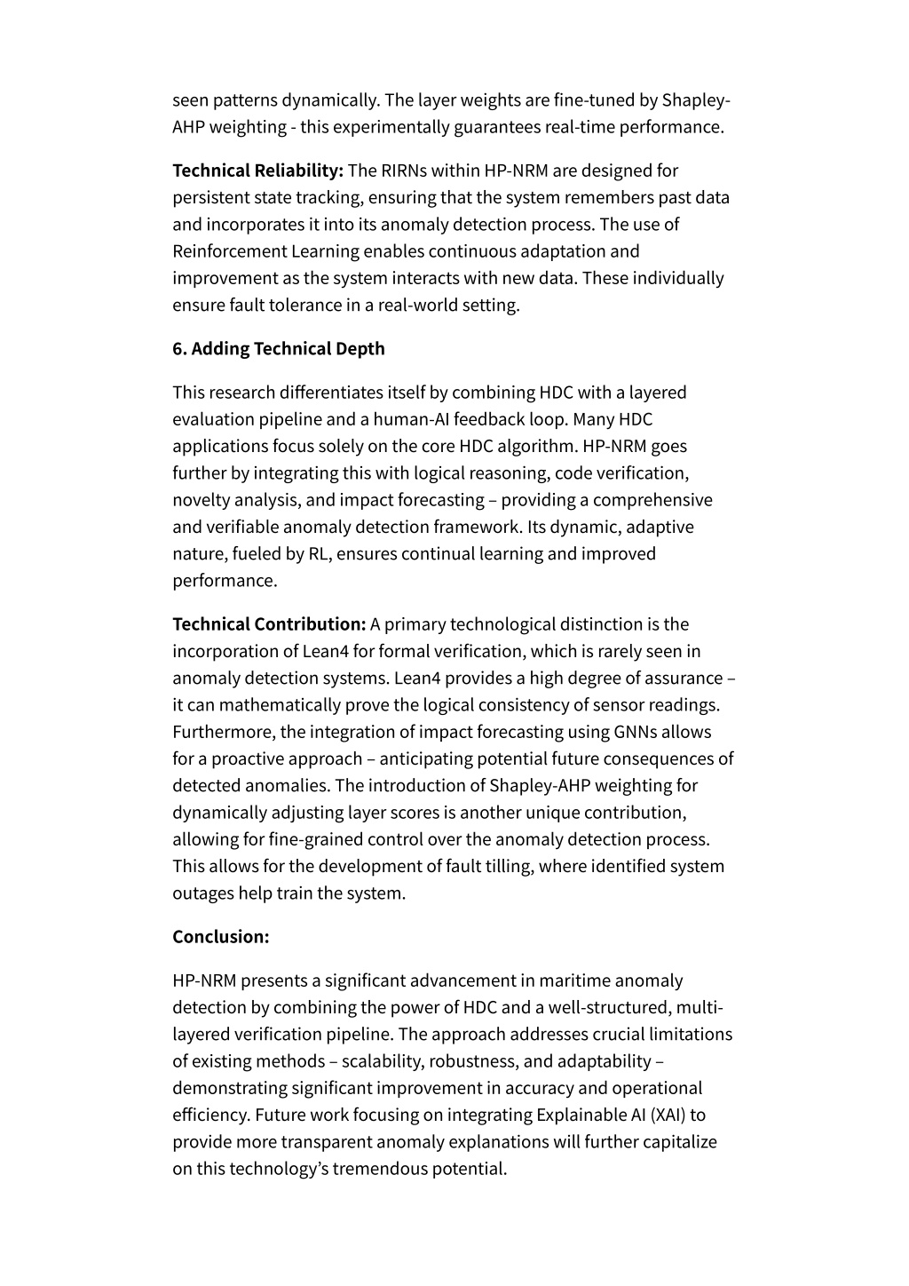 seen patterns dynamically. The layer weights are fine-tuned by Shapley- AHP weighting - this experimentally guarantees real-time performance. Technical Reliability: The RIRNs within HP-NRM are designed for persistent state tracking, ensuring that the system remembers past data and incorporates it into its anomaly detection process. The use of Reinforcement Learning enables continuous adaptation and improvement as the system interacts with new data. These individually ensure fault tolerance in a real-world setting. 6. Adding Technical Depth This research differentiates itself by combining HDC with a layered evaluation pipeline and a human-AI feedback loop. Many HDC applications focus solely on the core HDC algorithm. HP-NRM goes further by integrating this with logical reasoning, code verification, novelty analysis, and impact forecasting – providing a comprehensive and verifiable anomaly detection framework. Its dynamic, adaptive nature, fueled by RL, ensures continual learning and improved performance. Technical Contribution: A primary technological distinction is the incorporation of Lean4 for formal verification, which is rarely seen in anomaly detection systems. Lean4 provides a high degree of assurance – it can mathematically prove the logical consistency of sensor readings. Furthermore, the integration of impact forecasting using GNNs allows for a proactive approach – anticipating potential future consequences of detected anomalies. The introduction of Shapley-AHP weighting for dynamically adjusting layer scores is another unique contribution, allowing for fine-grained control over the anomaly detection process. This allows for the development of fault tilling, where identified system outages help train the system. Conclusion: HP-NRM presents a significant advancement in maritime anomaly detection by combining the power of HDC and a well-structured, multi- layered verification pipeline. The approach addresses crucial limitations of existing methods – scalability, robustness, and adaptability – demonstrating significant improvement in accuracy and operational efficiency. Future work focusing on integrating Explainable AI (XAI) to provide more transparent anomaly explanations will further capitalize on this technology’s tremendous potential.