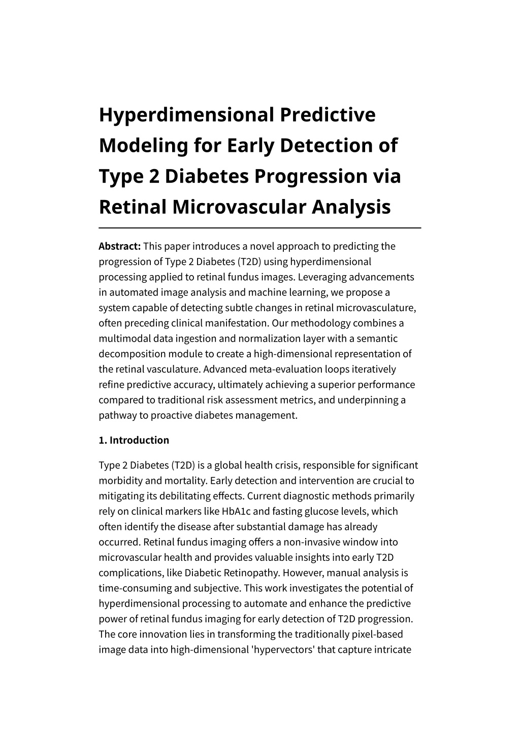 Hyperdimensional Predictive Modeling for Early Detection of Type 2 Diabetes Progression via Retinal Microvascular Analysis Abstract: This paper introduces a novel approach to predicting the progression of Type 2 Diabetes (T2D) using hyperdimensional processing applied to retinal fundus images. Leveraging advancements in automated image analysis and machine learning, we propose a system capable of detecting subtle changes in retinal microvasculature, often preceding clinical manifestation. Our methodology combines a multimodal data ingestion and normalization layer with a semantic decomposition module to create a high-dimensional representation of the retinal vasculature. Advanced meta-evaluation loops iteratively refine predictive accuracy, ultimately achieving a superior performance compared to traditional risk assessment metrics, and underpinning a pathway to proactive diabetes management. 1. Introduction Type 2 Diabetes (T2D) is a global health crisis, responsible for significant morbidity and mortality. Early detection and intervention are crucial to mitigating its debilitating effects. Current diagnostic methods primarily rely on clinical markers like HbA1c and fasting glucose levels, which often identify the disease after substantial damage has already occurred. Retinal fundus imaging offers a non-invasive window into microvascular health and provides valuable insights into early T2D complications, like Diabetic Retinopathy. However, manual analysis is time-consuming and subjective. This work investigates the potential of hyperdimensional processing to automate and enhance the predictive power of retinal fundus imaging for early detection of T2D progression. The core innovation lies in transforming the traditionally pixel-based image data into high-dimensional 'hypervectors' that capture intricate