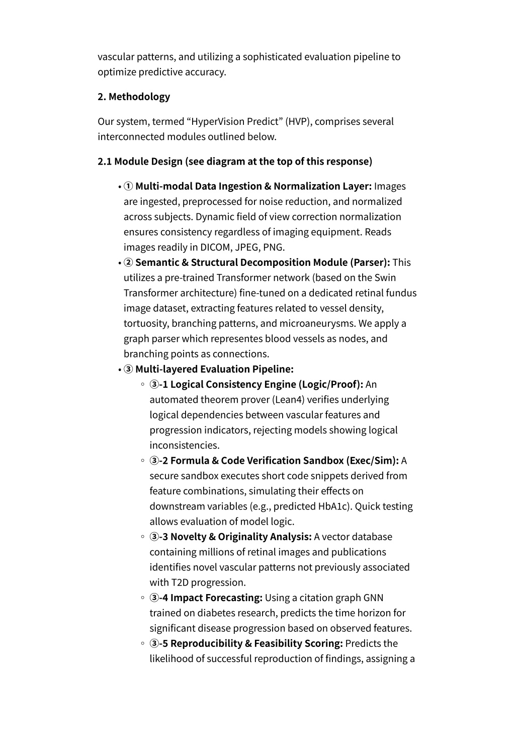 vascular patterns, and utilizing a sophisticated evaluation pipeline to optimize predictive accuracy. 2. Methodology Our system, termed “HyperVision Predict” (HVP), comprises several interconnected modules outlined below. 2.1 Module Design (see diagram at the top of this response) • ① Multi-modal Data Ingestion & Normalization Layer: Images are ingested, preprocessed for noise reduction, and normalized across subjects. Dynamic field of view correction normalization ensures consistency regardless of imaging equipment. Reads images readily in DICOM, JPEG, PNG. ② Semantic & Structural Decomposition Module (Parser): This utilizes a pre-trained Transformer network (based on the Swin Transformer architecture) fine-tuned on a dedicated retinal fundus image dataset, extracting features related to vessel density, tortuosity, branching patterns, and microaneurysms. We apply a graph parser which representes blood vessels as nodes, and branching points as connections. ③ Multi-layered Evaluation Pipeline: ③-1 Logical Consistency Engine (Logic/Proof): An automated theorem prover (Lean4) verifies underlying logical dependencies between vascular features and progression indicators, rejecting models showing logical inconsistencies. ③-2 Formula & Code Verification Sandbox (Exec/Sim): A secure sandbox executes short code snippets derived from feature combinations, simulating their effects on downstream variables (e.g., predicted HbA1c). Quick testing allows evaluation of model logic. ③-3 Novelty & Originality Analysis: A vector database containing millions of retinal images and publications identifies novel vascular patterns not previously associated with T2D progression. ③-4 Impact Forecasting: Using a citation graph GNN trained on diabetes research, predicts the time horizon for significant disease progression based on observed features. ③-5 Reproducibility & Feasibility Scoring: Predicts the likelihood of successful reproduction of findings, assigning a • • ◦ ◦ ◦ ◦ ◦