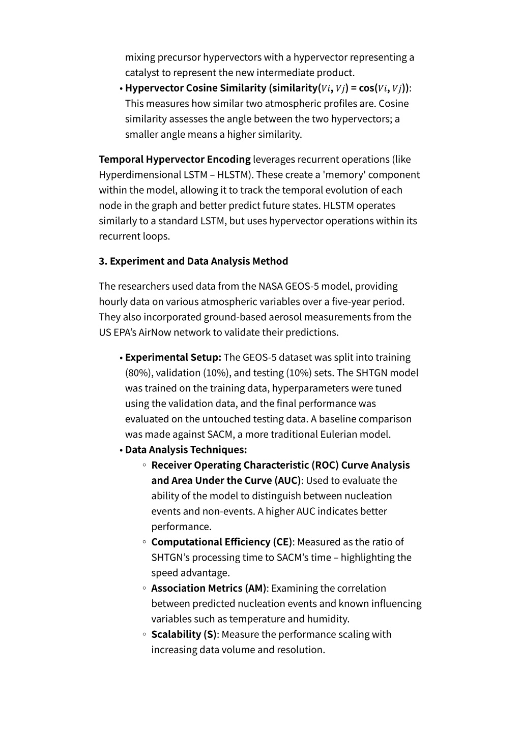 mixing precursor hypervectors with a hypervector representing a catalyst to represent the new intermediate product. Hypervector Cosine Similarity (similarity(??, ??) = cos(??, ??)): This measures how similar two atmospheric profiles are. Cosine similarity assesses the angle between the two hypervectors; a smaller angle means a higher similarity. • Temporal Hypervector Encoding leverages recurrent operations (like Hyperdimensional LSTM – HLSTM). These create a 'memory' component within the model, allowing it to track the temporal evolution of each node in the graph and better predict future states. HLSTM operates similarly to a standard LSTM, but uses hypervector operations within its recurrent loops. 3. Experiment and Data Analysis Method The researchers used data from the NASA GEOS-5 model, providing hourly data on various atmospheric variables over a five-year period. They also incorporated ground-based aerosol measurements from the US EPA’s AirNow network to validate their predictions. • Experimental Setup: The GEOS-5 dataset was split into training (80%), validation (10%), and testing (10%) sets. The SHTGN model was trained on the training data, hyperparameters were tuned using the validation data, and the final performance was evaluated on the untouched testing data. A baseline comparison was made against SACM, a more traditional Eulerian model. Data Analysis Techniques: Receiver Operating Characteristic (ROC) Curve Analysis and Area Under the Curve (AUC): Used to evaluate the ability of the model to distinguish between nucleation events and non-events. A higher AUC indicates better performance. Computational Efficiency (CE): Measured as the ratio of SHTGN’s processing time to SACM’s time – highlighting the speed advantage. Association Metrics (AM): Examining the correlation between predicted nucleation events and known influencing variables such as temperature and humidity. Scalability (S): Measure the performance scaling with increasing data volume and resolution. • ◦ ◦ ◦ ◦