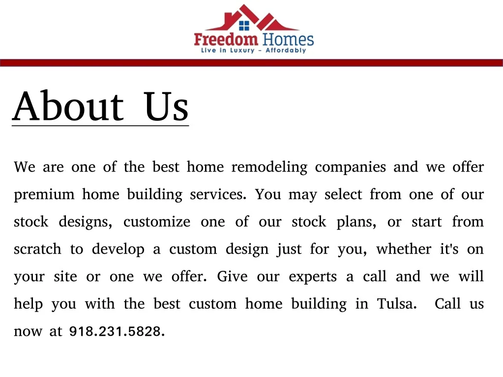 About Us We are one of the best home remodeling companies and we offer premium home building services. You may select from one of our stock designs, customize one of our stock plans, or start from scratch to develop a custom design just for you, whether it's on your site or one we offer. Give our experts a call and we will help you with the best custom home building in Tulsa. Call us now at 918.231.5828.