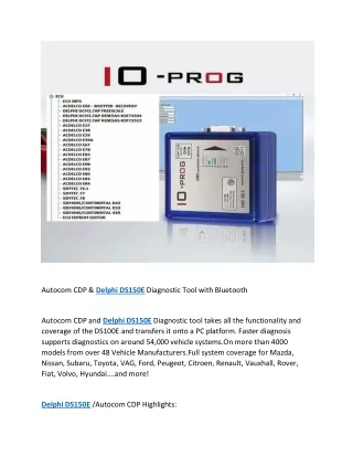 Autocom CDP & Delphi DS150E Diagnostic Tool with Bluetooth Autocom CDP and Delphi DS150E Diagnostic tool takes all the functionality and coverage of the DS100E and transfers it onto a PC platform. Faster diagnosis supports diagnostics on around 54,000 vehicle systems.On more than 4000 models from over 48 Vehicle Manufacturers.Full system coverage for Mazda, Nissan, Subaru, Toyota, VAG, Ford, Peugeot, Citroen, Renault, Vauxhall, Rover, Fiat, Volvo, Hyundai….and more! Delphi DS150E /Autocom CDP Highlights: