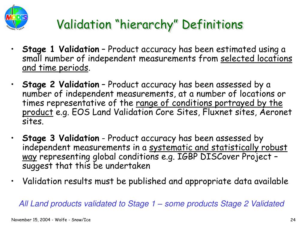 Validation “hierarchy” Definitions • Stage 1 Validation – Product accuracy has been estimated using a small number of independent measurements from selected locations and time periods. • Stage 2 Validation – Product accuracy has been assessed by a number of independent measurements, at a number of locations or times representative of the range of conditions portrayed by the product e.g. EOS Land Validation Core Sites, Fluxnet sites, Aeronet sites. • Stage 3 Validation - Product accuracy has been assessed by independent measurements in a systematic and statistically robust way representing global conditions e.g. IGBP DISCover Project – suggest that this be undertaken • Validation results must be published and appropriate data available All Land products validated to Stage 1 – some products Stage 2 Validated