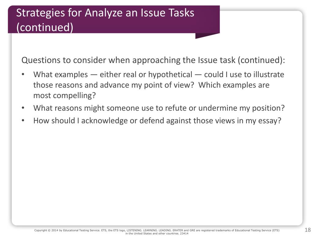 Strategies for Analyze an Issue Tasks Questions to consider when approaching the Issue task: • What precisely is the central issue? • What precisely are the instructions asking me to do? • Do I agree with all or with any part of the claim? Why or why not? • Do I agree with the claim only under certain circumstances? What are those circumstances? • Does the claim make certain assumptions? If so, are they reasonable? • Do I need to explain how I interpret certain terms or concepts used in the claim? • If I take a certain position on the issue, what reasons support my position? 17